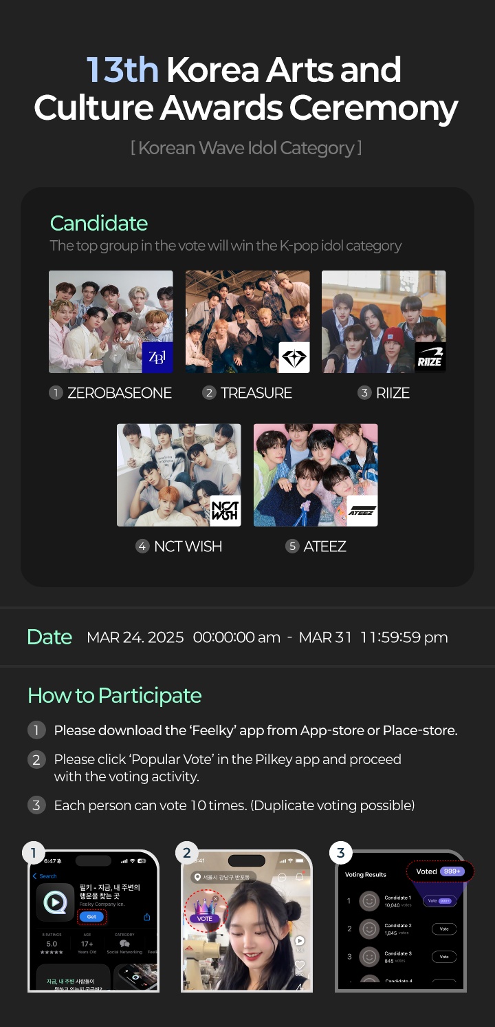 제 13회 대한민국 예술 문화인 대상 시상식에 TREASURE가 후보로 올랐습니다! 작성자그냥저냥|작성시간25.03.24|조회수42 목록 댓글 0 글자크기 작게가 글자크기 크게가 제 13회 대한민국 예술 문화인 대상 시상식에 TREASURE가 후보로 올랐습니다! 투표 1위 그룹은 한류 아이돌 부문 수상자로 선정되오니 많은 관심과 투표 부탁드립니다! 다음검색 현재 게시글 추가 기능 열기 북마크 공유하기 신고 센터로 신고 댓글 댓글 0 댓글쓰기 답글쓰기 댓글 리스트