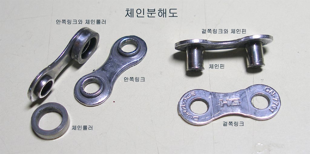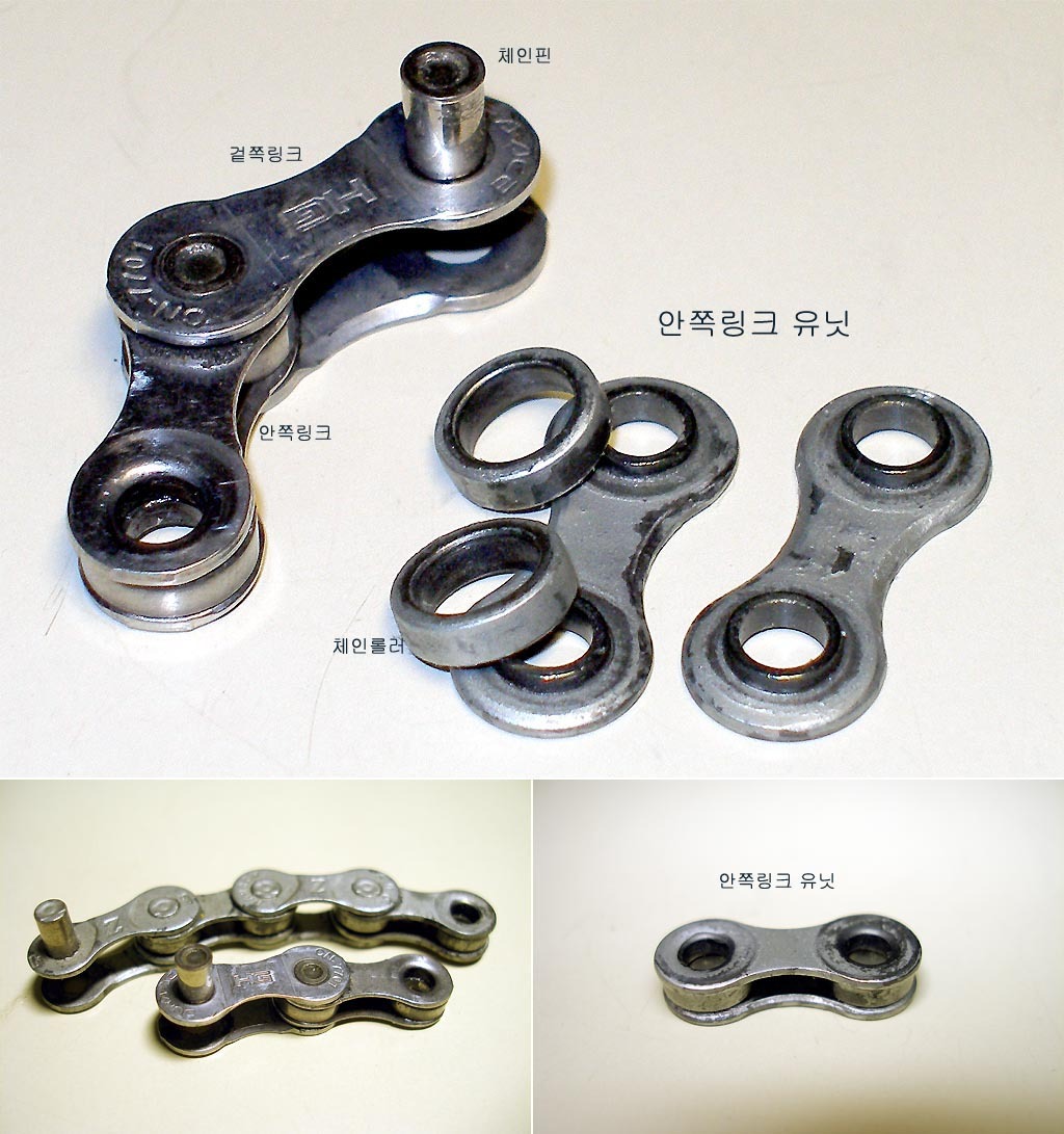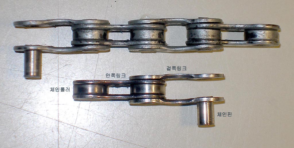체인은 사진1에서 보는 바와 같이 겉쪽링크, 안쪽링크, 체인롤러, 체인핀 이라는 4개의 부속들이