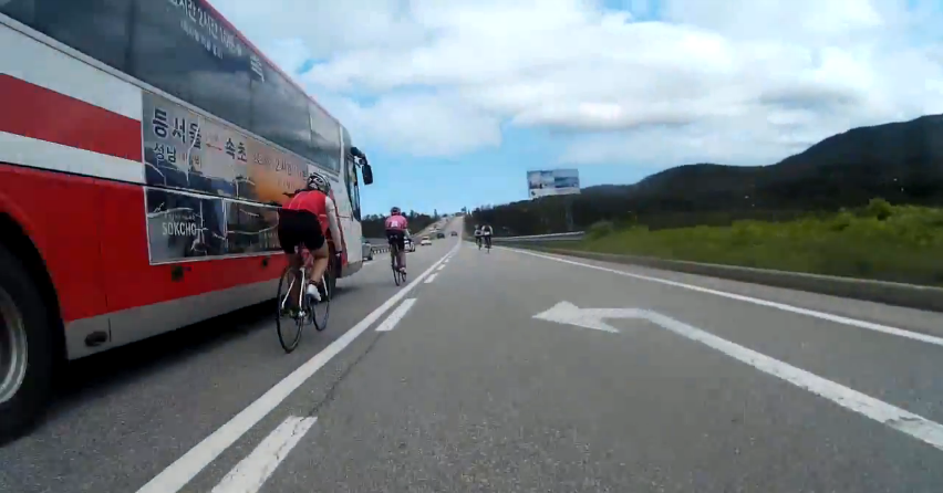 그대로 2차로로 고속 주행하여 버스풍에 자전거를 날리게 한것은