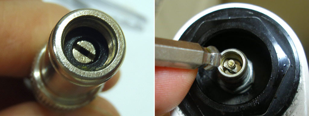 연결부를 더 돌려 체결하는 중에, 가운데 일자머리 나사 모양의 돌기가 우측의