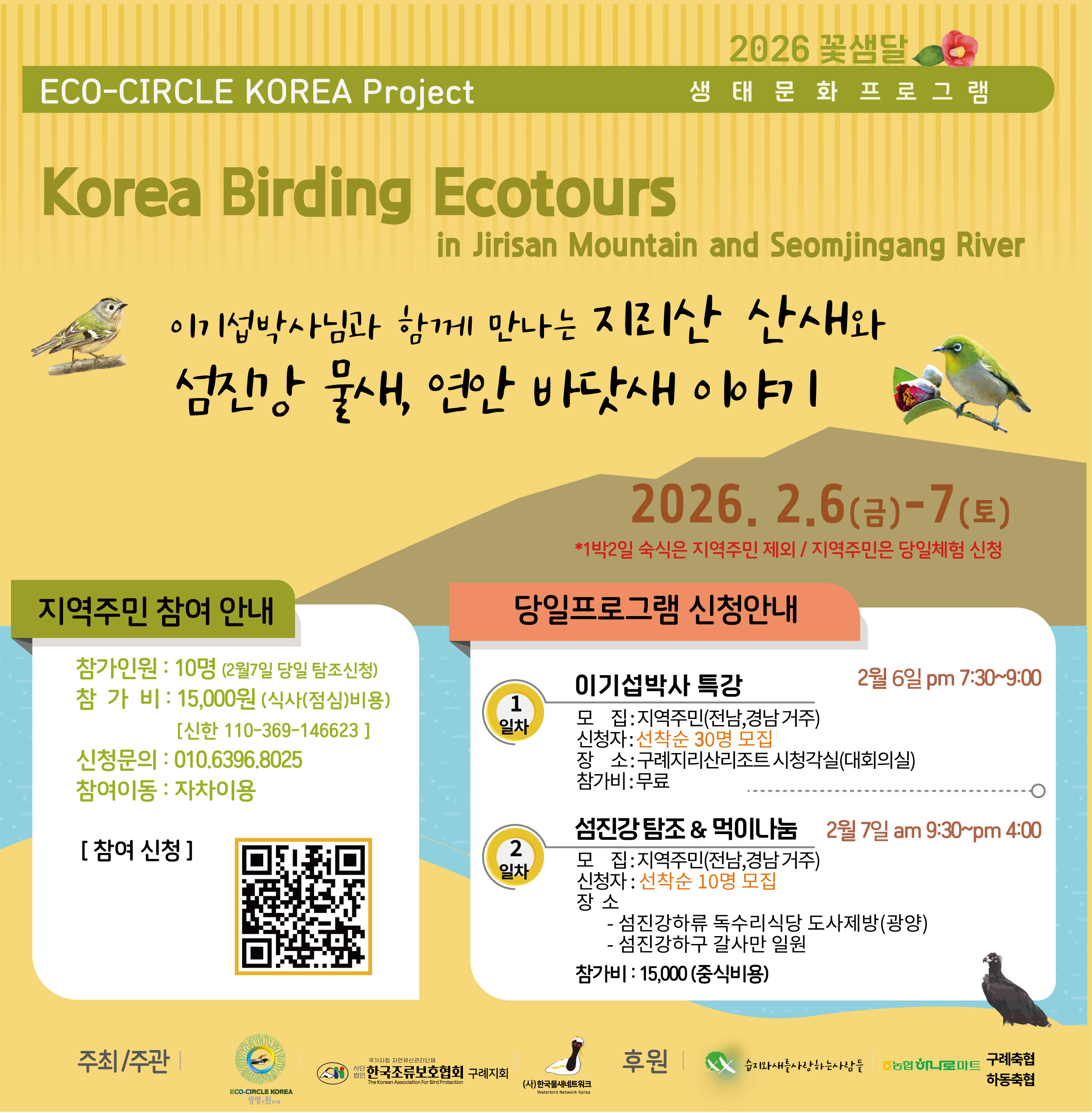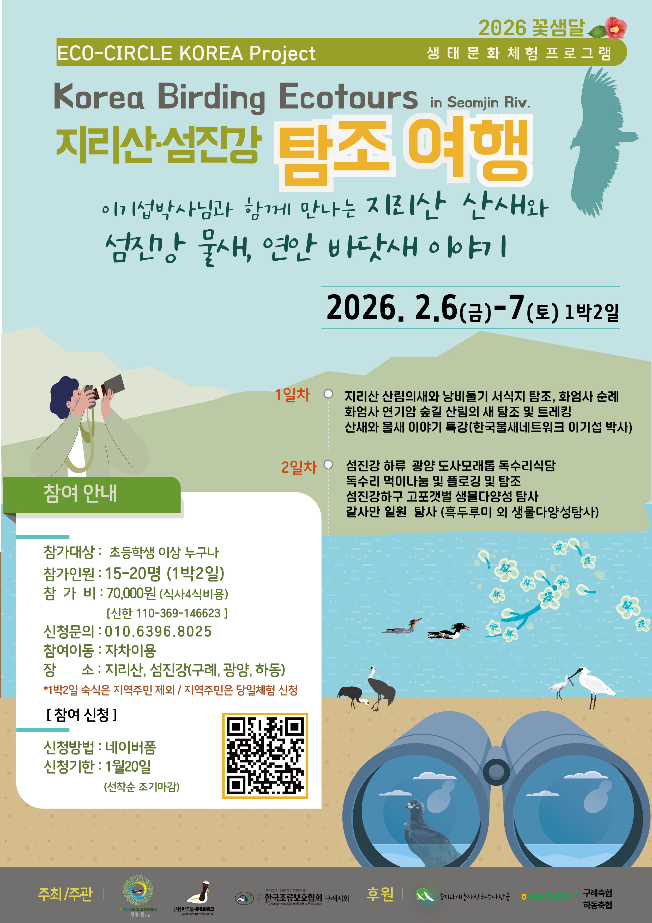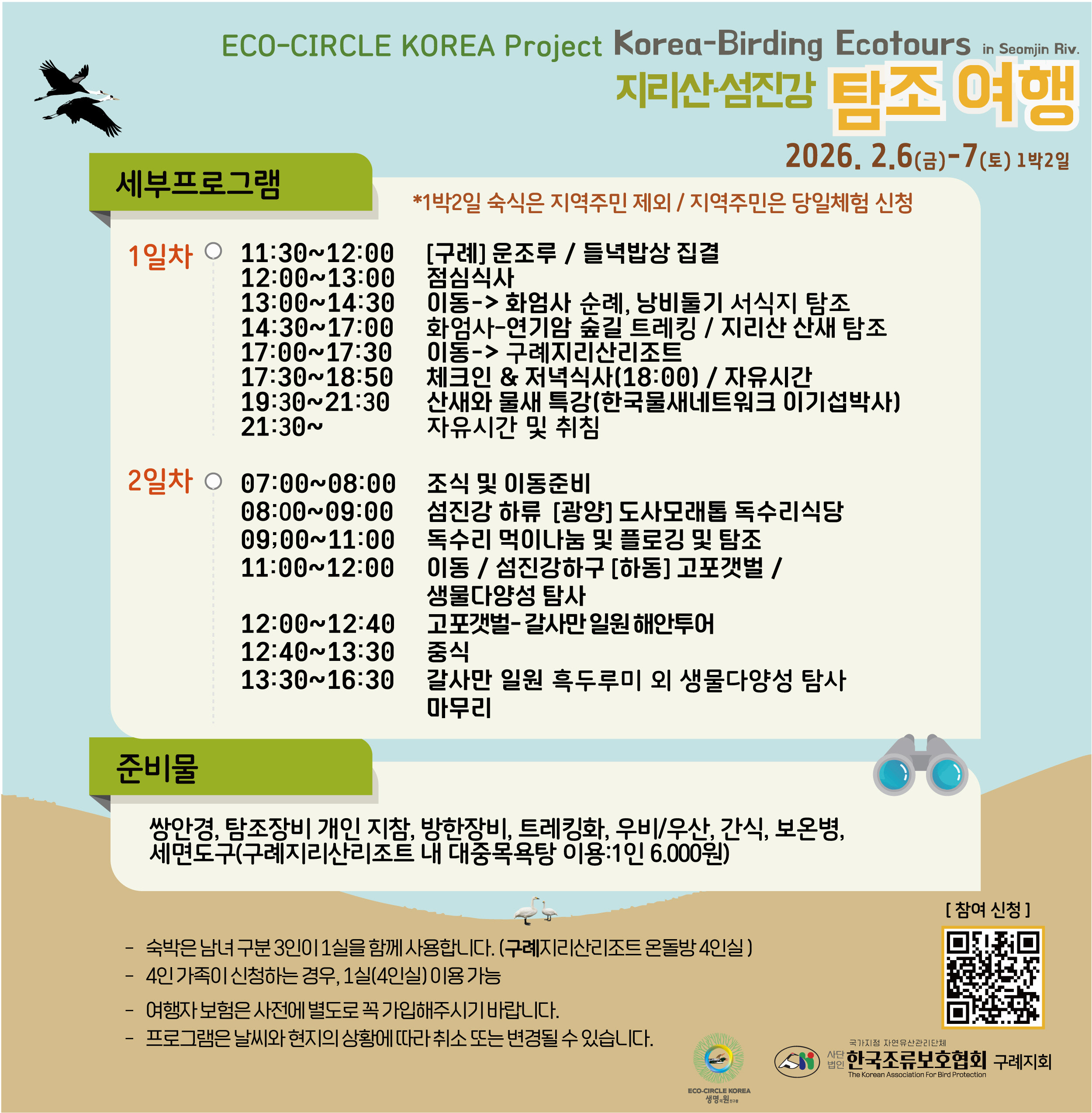 올해 2월 6~7일에 지리산 섬진강 탐조프로그램이 1박2일 진행될 예정입니다.