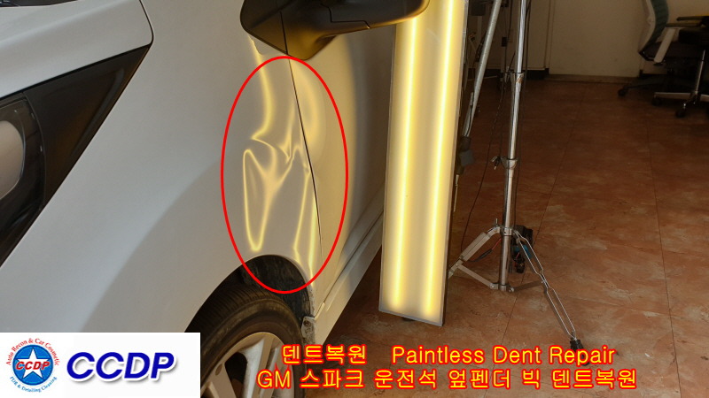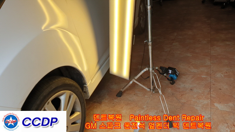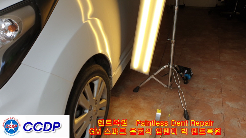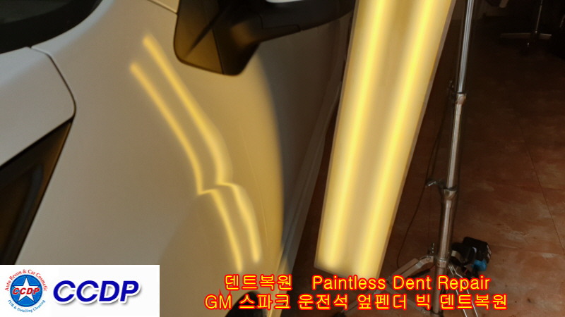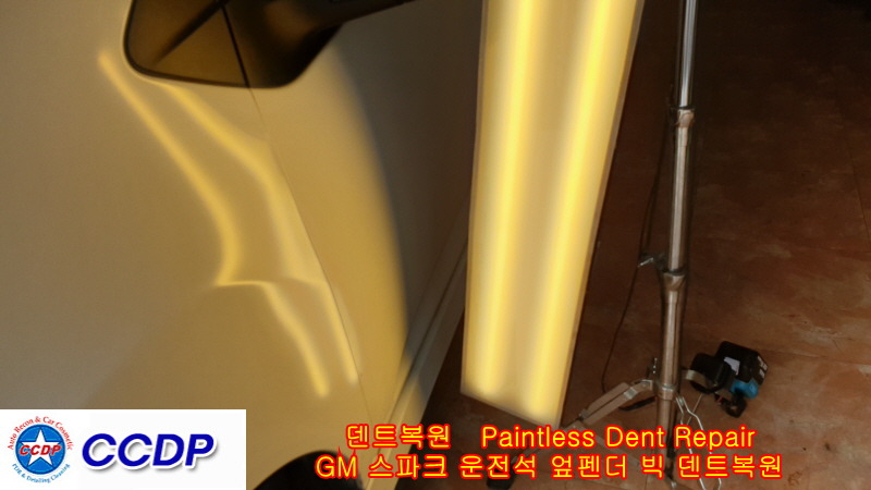 - 이런 찌그러짐의 덴트복원은 넓은 부위 중심을 당기거나 푸쉬 하면 철판이 틀어져 면 정리에 어려워짐
