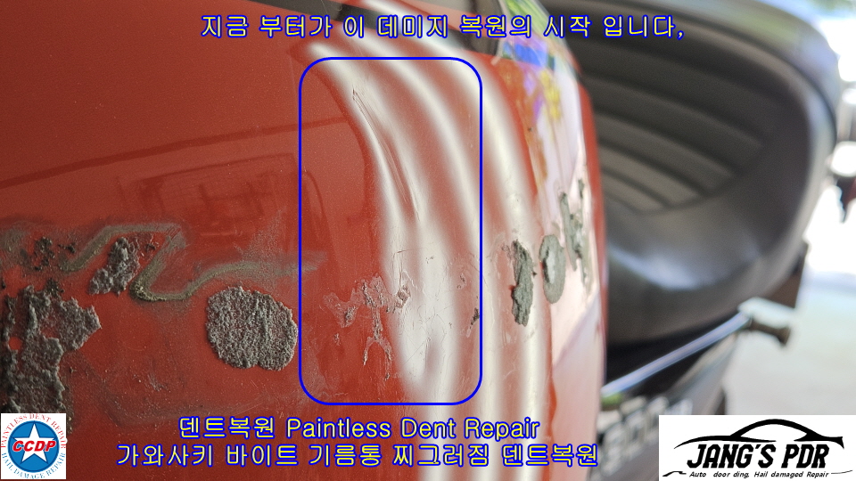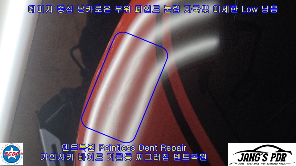 - 데미지 중심을 최대한 복원 하려 수없이 당기고 낮추기를 반복 하였지만 페인트의 투명 페임 자국및 페인트 눌림 자국이