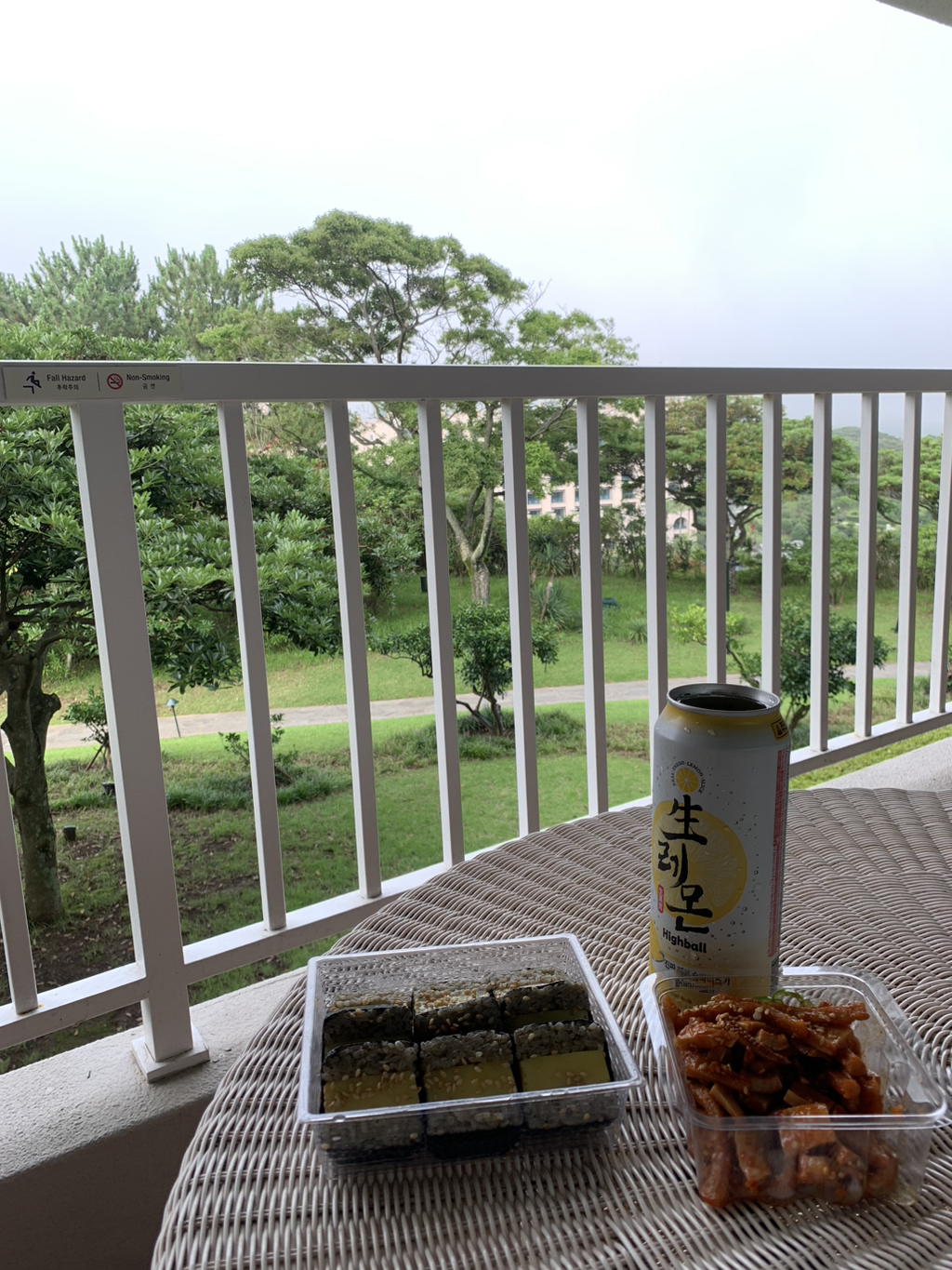 혼자 먼저 체크인 했어서 테라스에서 혼낮술했긔 전복김밥과 생레몬하이볼 크흐