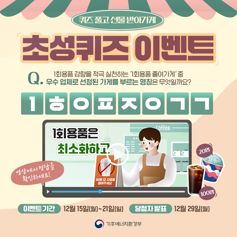 1회용품 줄이는데에 기여하는 가게 홍보 영상인데 간단한 초성퀴즈랑 응원메시지 작성하면