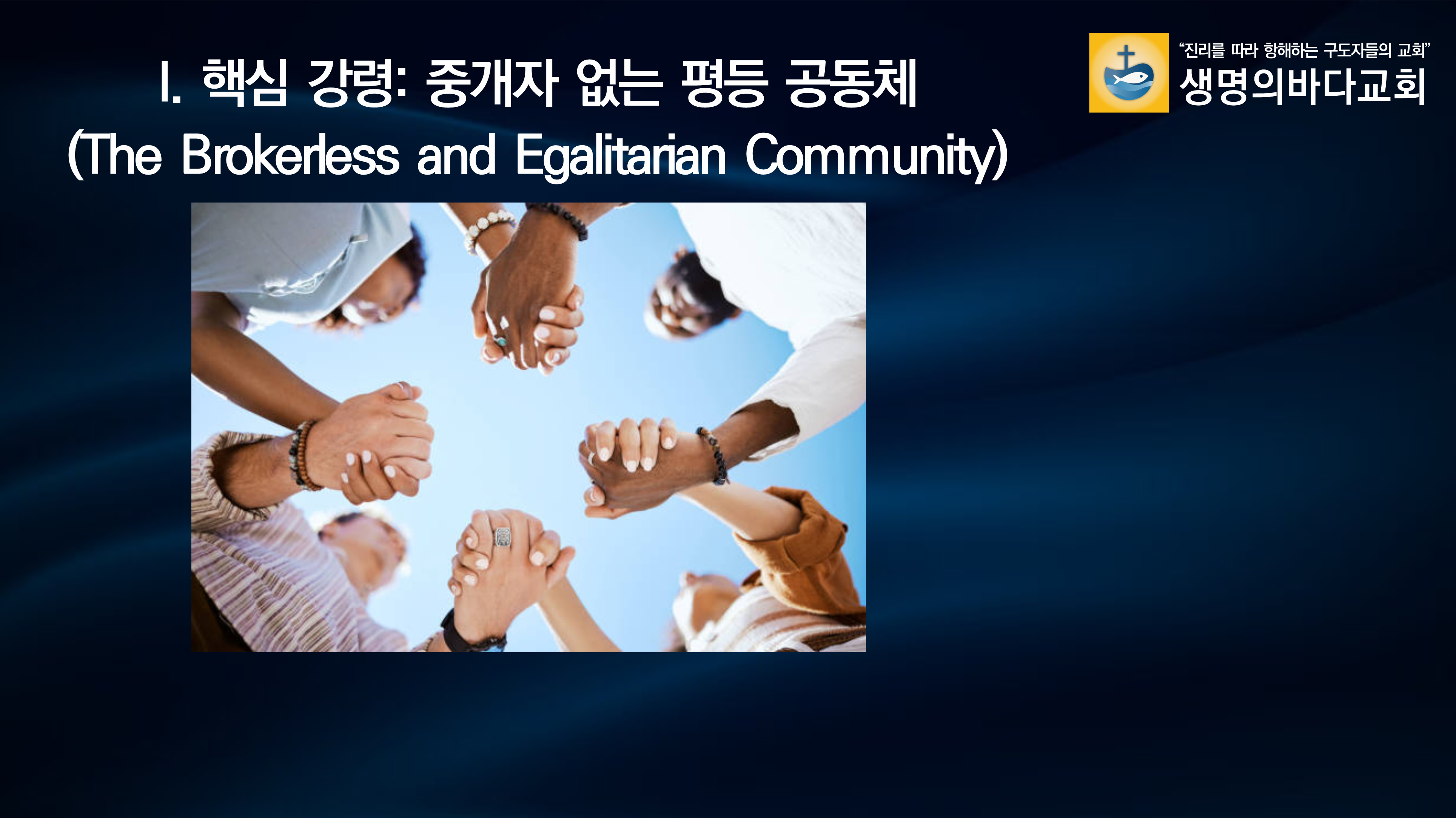 우리는 예수 그리스도를 따르는 모든 구도자가 사역자이며, 영적 권위의 중개자나 독점자가 없음을 선언한다. 중개자 없는 공동체란 하나님과 사람 사이의 권위를 독점하지 않고 모두가 봉사하는 공동체를 의미한다.