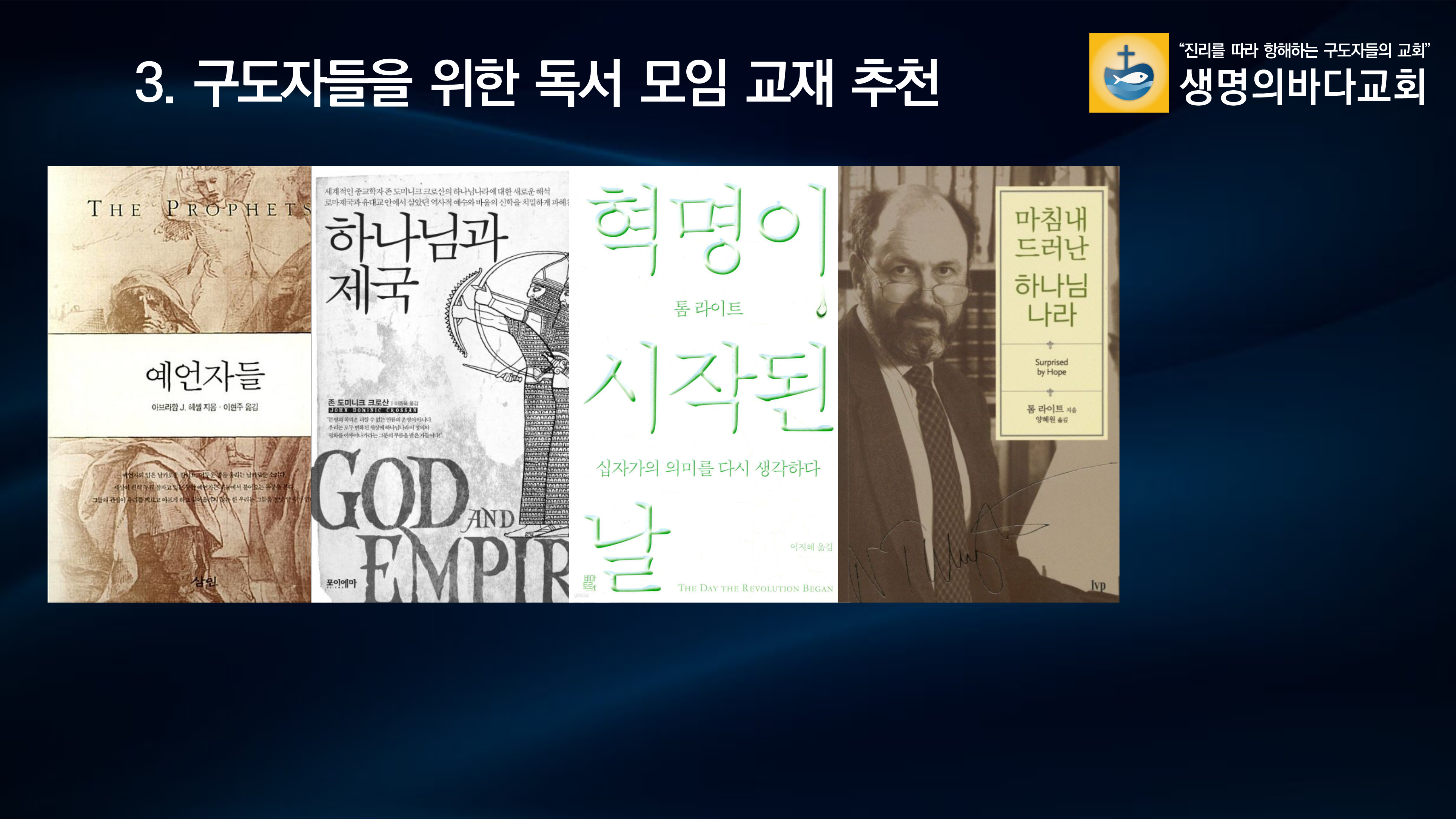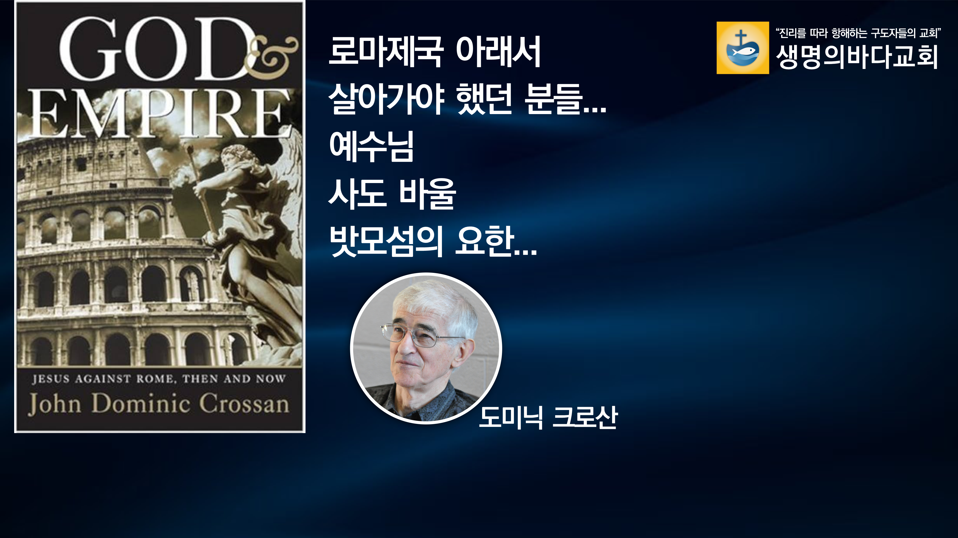 생명의바다교회는 바로 이 신학적 갱신의 결론이자 새로운 출발점입니다. 우리는 더 이상 제국의 지배원리에 길들여진 채 안주하지 않을 것입니다. 우리는 톰 라이트가 제시한 거대한 비전을 붙잡고, 마커스 보그가 요구한 윤리적 실천을 통해, 존 도미닉 크로산이 증언한 급진적인 평등 공동체를 재건할 것입니다.