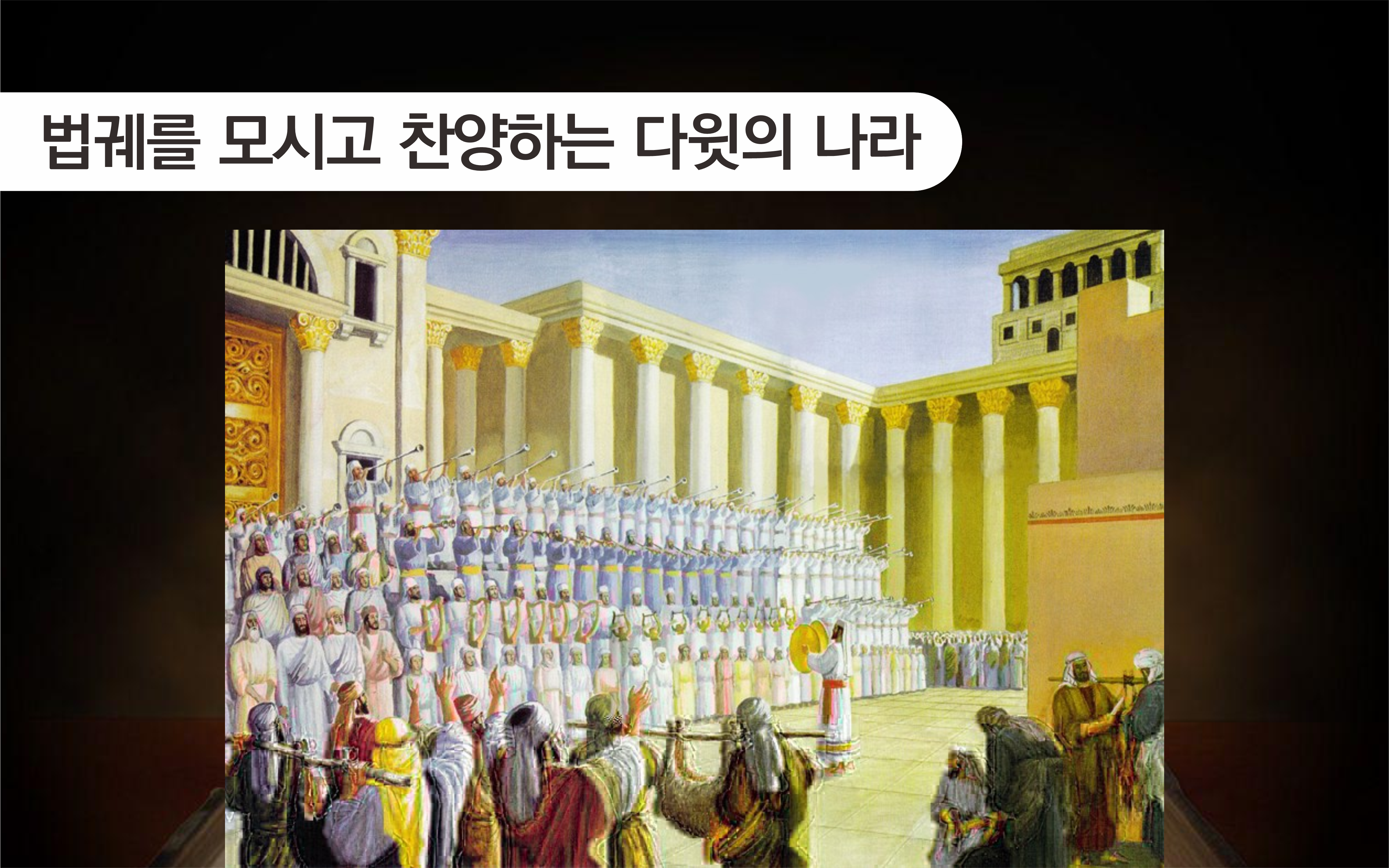 그런데 우리가 읽은 본문인 역대기상 16장은 다윗이 하나님의 법궤를 자기 성으로 모시고 와서 장막에 안치한 이야기를 들려줍니다. 그러므로 이 이야기는 역대기의 독자들이 볼 때는 약 700년 전의 일입니다. 그들은 포로에서 돌아와서 다윗이 어떻게 나라를 세웠는지를 읽으면서 자신들의 나라를 다시 세우는 방법을 생각할 것입니다. 그래서 역대기서에는 성전과 제사에 대한 이야기가 중요하게 다루어집니다.