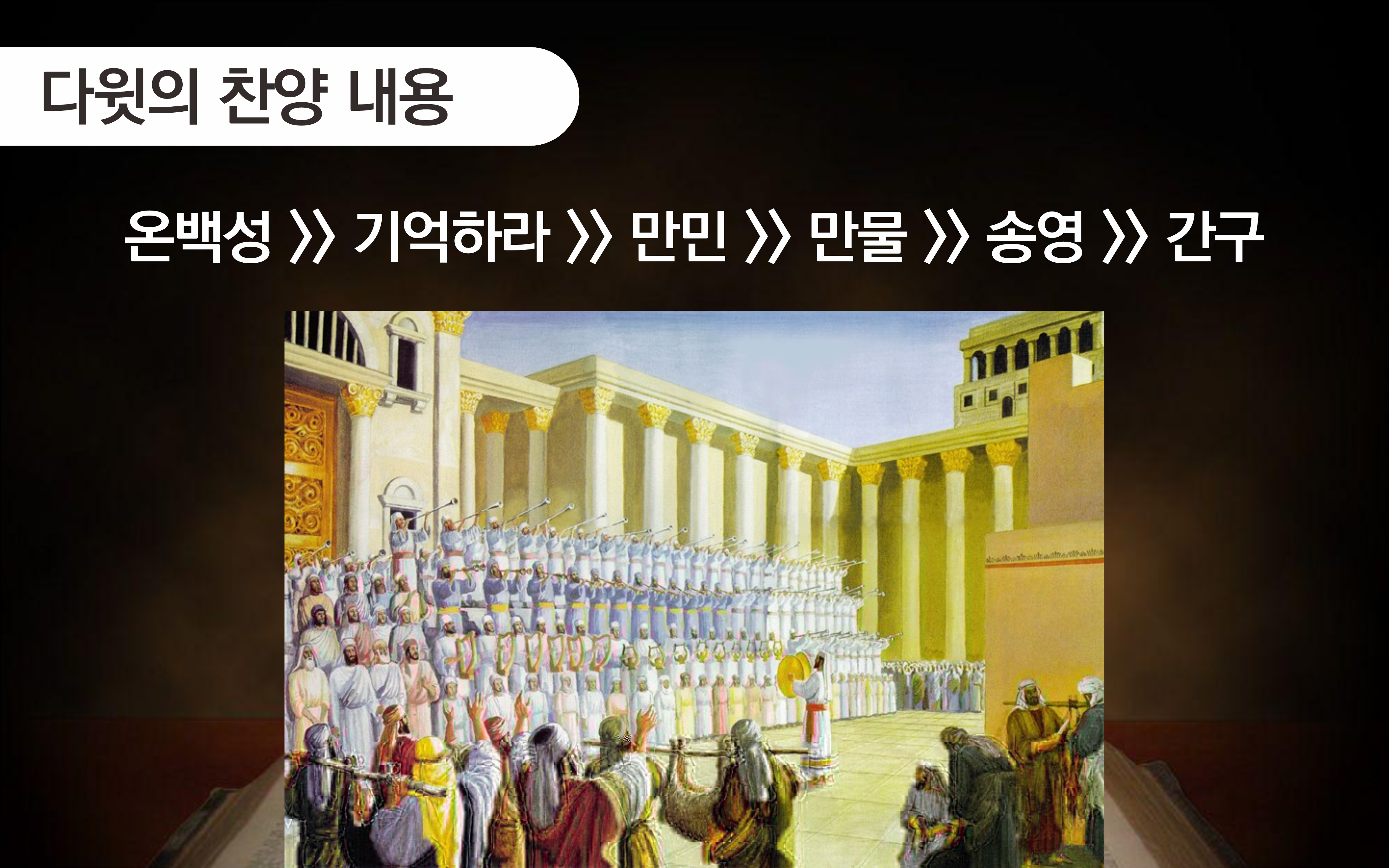 이런 상황 속에서 우리는 공통적으로 한 가지 주제를 생각해 볼 수 있다. 그것은 어떻게 다시 세울 것인가 하는 것이다. 다윗은 하나님의 법궤를 자기 성으로 모신 후에 그것을 지키는 사람들을 세우고 그 앞에 정례적으로 제사를 드릴 사람들을 세웠다. 아울러 모든 백성을 불러 모으고 그들에게 떡 한덩이와 과자를 나누어주면서 하나님의 법궤를 모신 기념의 잔치를 벌였다. 그 잔치에서 많은 찬양대와 연주단, 그리고 찬양의 지휘자들이 등장한다. 찬양으로 온 백성의 마음이 하나로 뭉쳤고, 그 찬양 속에 백성들이 기억하고 힘써야 할 일이 담겨 있었다. 찬양으로 다윗은 나라를 다시 세울 수 있는 길을 찾았다.