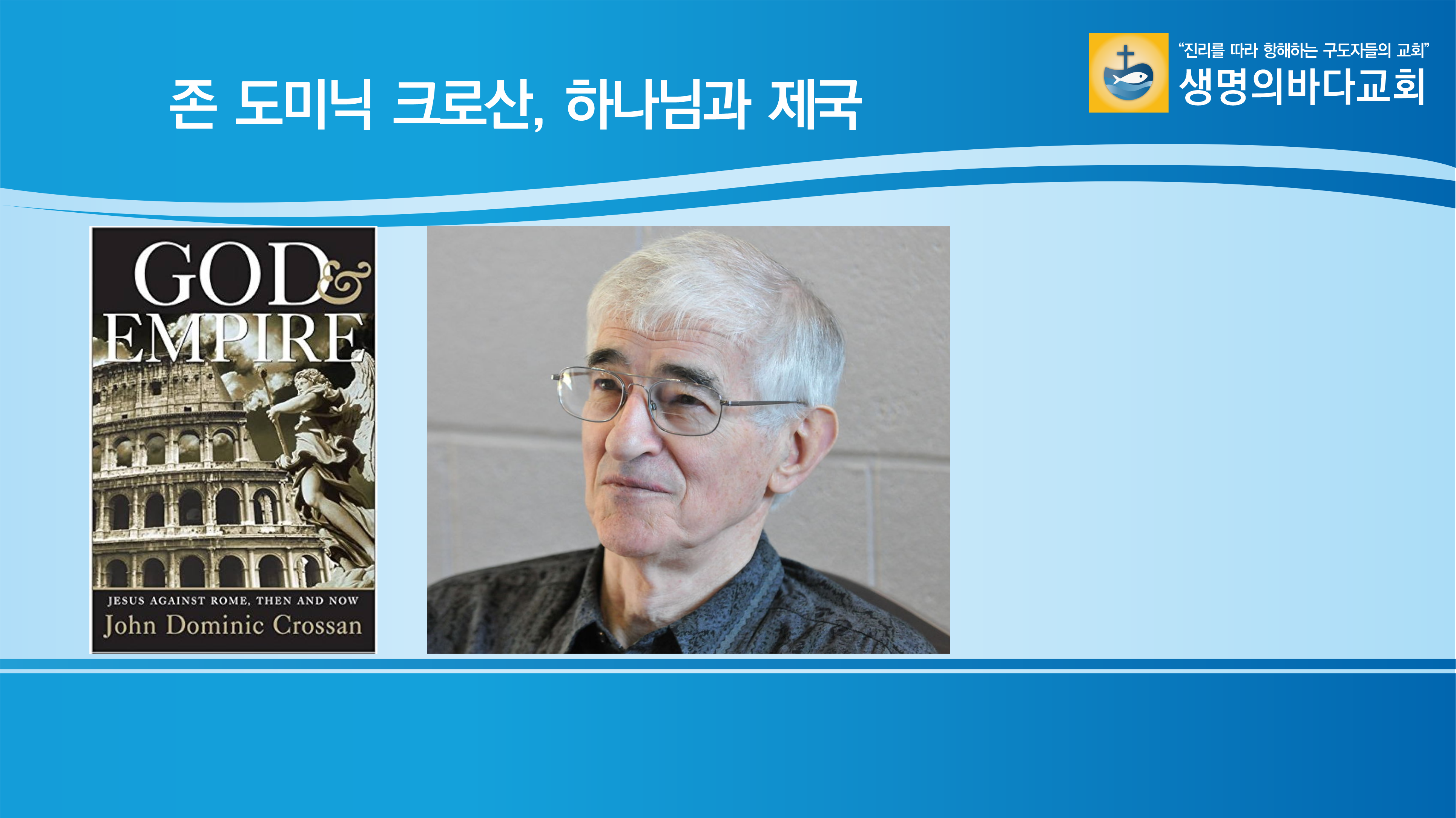나는 이번 주간에 존 도미닉 크로산의 책, ‘하나님과 제국’(God & Empire: Jesus Against Rome, Then and Now)을 읽으면서 그 내용을 요약했다. 지난 주에는 제국의 논리에 물들지 말고 하나님 나라의 정신을 따르는 삶을 살자는 메시지를 전했다.
