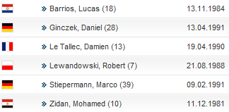 18.바리오스 84년생 파라과이 28.긴첵 91년생 독일 13.르 탈렉 90년생 프랑스 7.레반도프스키 88년생 폴란드