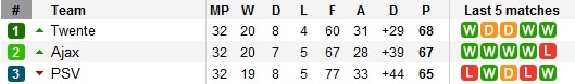이번 32R에서 트벤테와 아약스가 승리하고 PSV가 페예노르트에게 1-3 패배를 당하며 순위가 또 바뀌었습니다