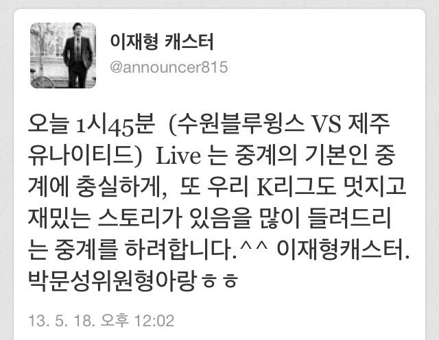 본인피셜) 수원vs제주 이재형캐스터, 박문성해설 선발 작성자alligatorSky|작성시간13.05.18|조회수584 목록 댓글 6 글자크기 작게가 글자크기 크게가 ㅎㅎ 다음검색 현재 게시글 추가 기능 열기 북마크 공유하기 신고 센터로 신고 댓글 댓글 6 댓글쓰기 답글쓰기 댓글 리스트 작성자연세(U)★서울(KC)★고양(K) | 작성시간 13.05.18 박문성이 젤 좋은데 ㅋㅋ 작성자Birdwoo | 작성시간 13.05.18 이재형 캐스터도 좋아 ㅋㅋㅋㅋㅋ 삭제된 댓글입니다. 답댓글 작성자Suwon No.11 베르손 | 작성시간 13.05.18 음성지원되요...ㅋ 답댓글 작성자alligatorSky 작성자 본인 여부 작성자 | 작성시간 13.05.18 헐 ㅋㅋㅋㅋㅋㅋㅋ 댓글 전체보기