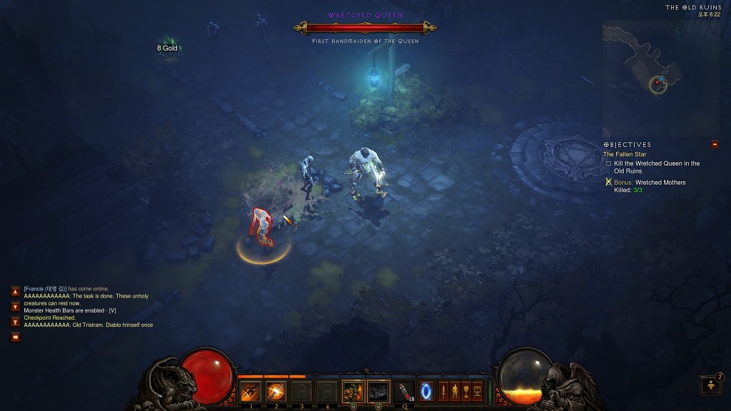 계속 진행하면 올드 루인즈가 나오고 목표물인 wretched queen를 찾아야 한다. 이 장소에는 웨이포인트가 있으니 잡기전에 정비를 하는것도 좋다.참고로 타운포탈 기능은 퀘스트를 좀더 진행해야 사용이 가능해서 현재 사용은 불가능하다. 스샷위의 몬스터가 wretched queen인데 미니맵상에서 노란 원으로 표시되므로 찾는데는 어렵지않다. wretched queen를 잡았다면 웨이포인트를 이용하여 마을로 돌아가서 캡틴 럼포드(마을안에 위치)와 대화를 하자. 참고로 웨이포인트에서 노란 성배모양과 노란색글씨로 된 장소가 퀘스트진행 장소이다.. 퀘스트를 완료하면 이번에는 레아가 느낌표를 띄고있을 것이다. 레아와 대화를 하자.