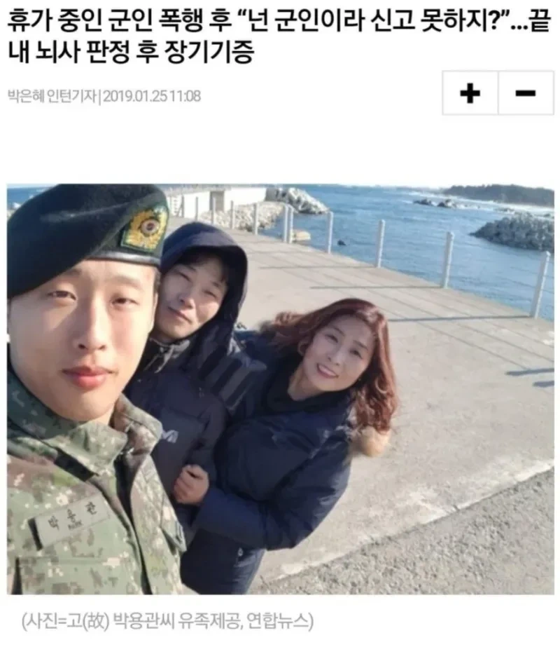 피해자는 6년간 역도선수도했고 태권도 3단이었다는데 단지 군인이라는 이유로 반격도 못하고 맞았다가 넘어지면서 뇌를 다치고 뇌사판정됐고 이런 군인들과 관련된 법을 개선해달라고 유가족이 호소했지만 국회는 받아들여주지않음 참고로 가해자는 합의안했음 근데 4년임