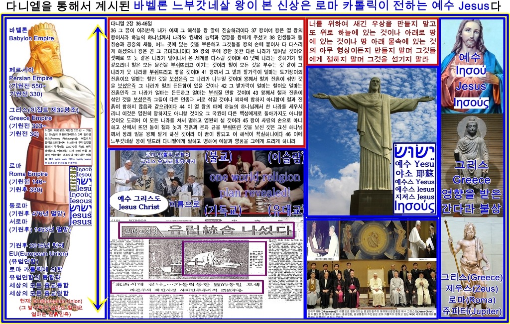 이 마지막 때에 바벨론 느부갓네살 왕의 꿈을 통해서 계시된 신상(우상)으로 로마 카톨릭이 행하고 있는 혼합된 종교통합 종교연합 에큐메니컬운동을 보시고 우상숭배의 혼합된 예수 Ιησού Iesu 예수스 Ιησούς Iesus 지저스 Jesus란 이름으로부터 창조주 하나님 아버지 주 אדני Yeshuah יהוה YHUH 예슈아 ישוע Yeshua님의 거룩하신 성호를 믿고 부르는 믿음으로 돌이키는 회개를 행하시기를 바랍니다.