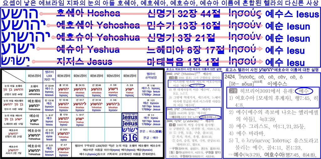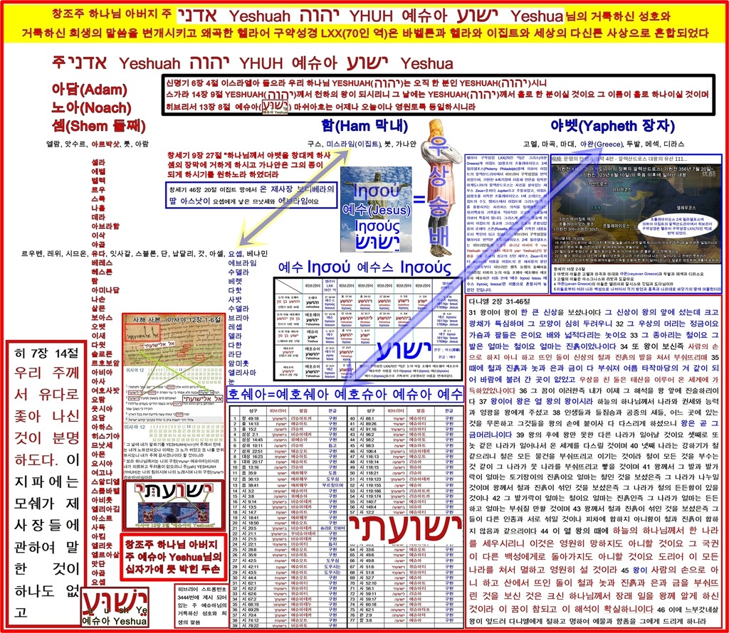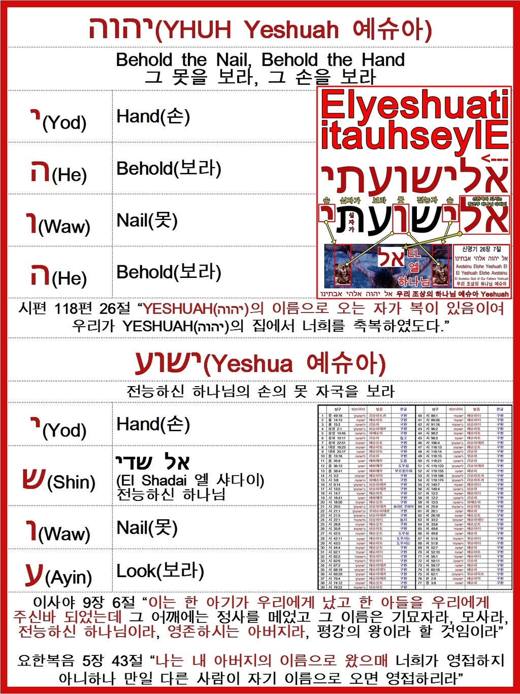 창조주 하나님 아버지 주 אדני Yeshuah יהוה YHUH 예슈아 ישוע Yeshua님의 거룩하신 성호를 예수 Ιησού Iesu 예수스 Ιησούς Iesus 지저스 Jesus란 이름으로 바꿔놓은 것.