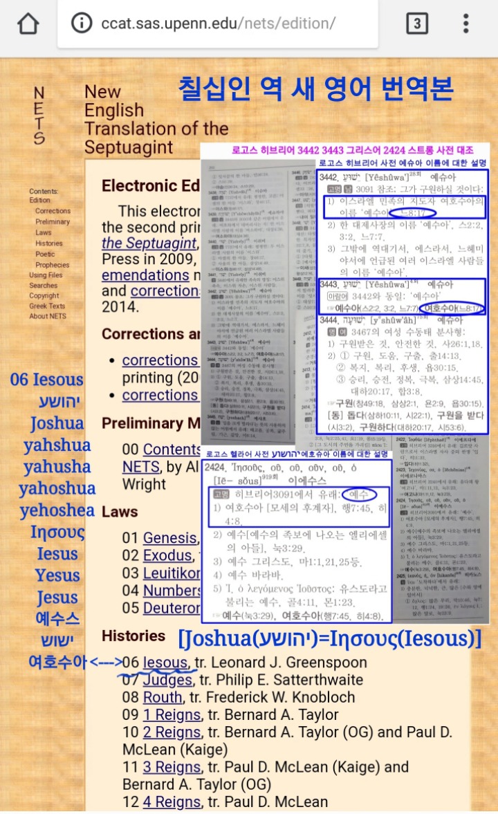 그리스어 칠십인 역 새 영어 번역본은 '여호수아(יהושע)'의 이름을 'Ιησους=Iesous'라고 밝히고 있습니다.