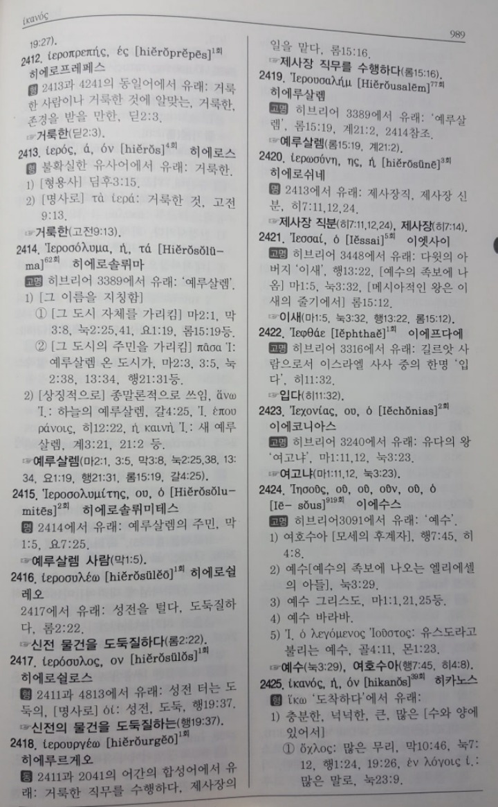 그리스어 사전 스트롱번호 2424번은 여호수아(יהושע)의 그리스어 이름이 'Ιησους'이며 영문으로 'Iesous'임을 밝히고 있고 한글 이름은 '예수'라고 밝히고 있습니다.