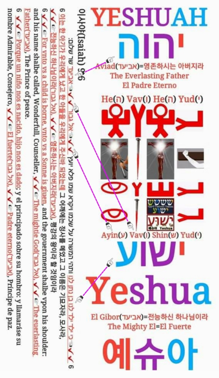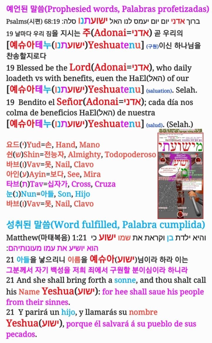 구약성경의 원문인 히브리어 구약성경 시편 68:19절의 히브리어 스트롱번호 3444번의 말씀인 "예슈아테누(ישועתנו)Yeshuatenu"를 풀어 보면 말씀이 육체가 되어 오실 창조주 하나님 아버지이신 "예슈아(ישוע)Yeshua"님께서 자신의 백성들을 죄에서 구원하시기 위하여 한 아기 한 아들 어린양으로 오셔서 "타브(ת)Tav=십자가, Cross, Cruza"에 "바브(ו)Vav=못, Nail, Clavo" 박혀 피(מ) 흘려 죽으실 것임이 계시되어 있는 말씀인 것입니다.