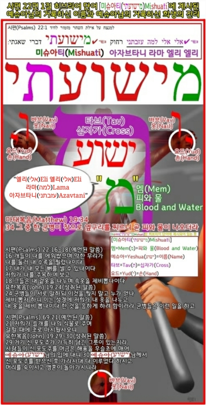 말씀이 육체가 되어 오신 창조주 하나님 아버지 "예슈아(ישוע)Yeshua"님의 거룩하신 이름과 거룩하신 희생(ת)의 진리는 구약성경의 원문인 히브리어 구약성경 시편 22:1절에 계시되어 있는 말씀 그대로 성취되었습니다.
