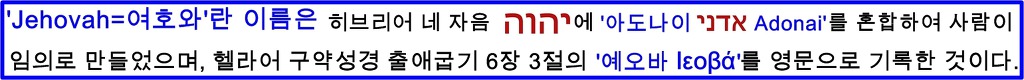 '여호와(Yehovah)'란 이름은 창조주 하나님 아버지의 거룩하신 이름인 히브리어 네 자음"יהוה"에 히브리어 '아도나이(אדני)Adonai'의 모음을 결합하여 사람에 의하여 만들어진 이름이기 때문에 다른 구원자의 이름이 되는 것입니다.