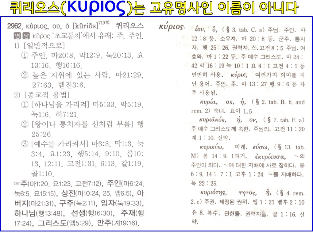 그리스어 퀴리오스(Κύριος) 퀴리우(Κύριου) 퀴리온(Κύριον)등은 창조주 하나님 아버지의 거룩하신 이름인 고유명사가 아니다.