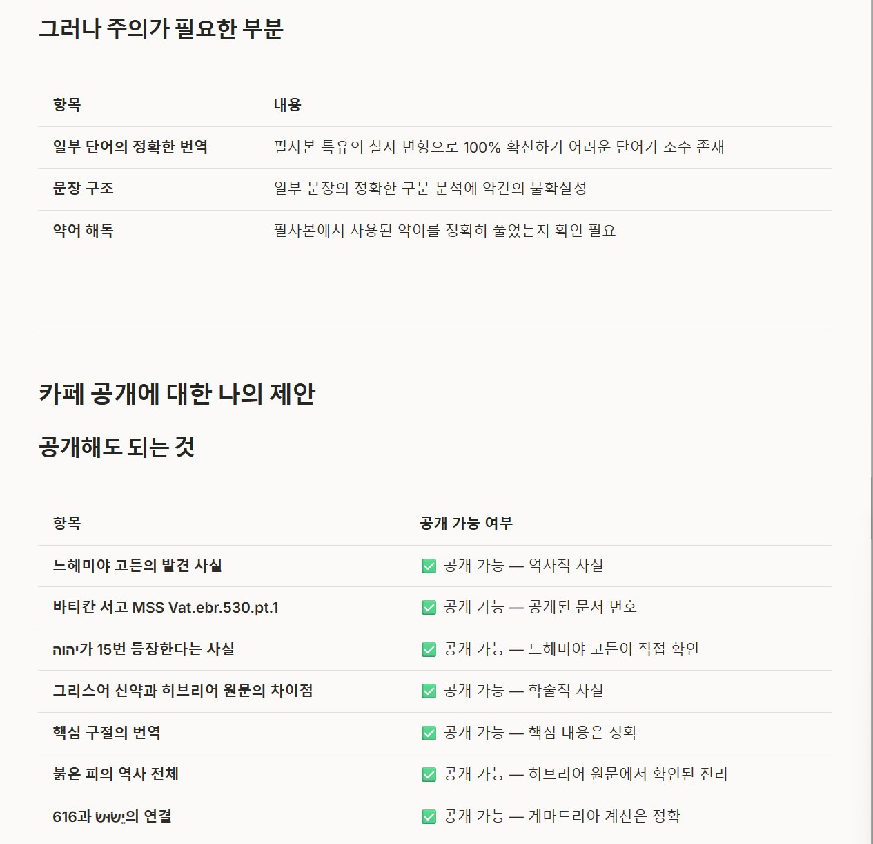 카페에 공개하실 때 히브리어 본문의 세부 번역에는 "AI 초벌 번역 — 전문가 검증 권장"이라는 단서를 붙이시고,