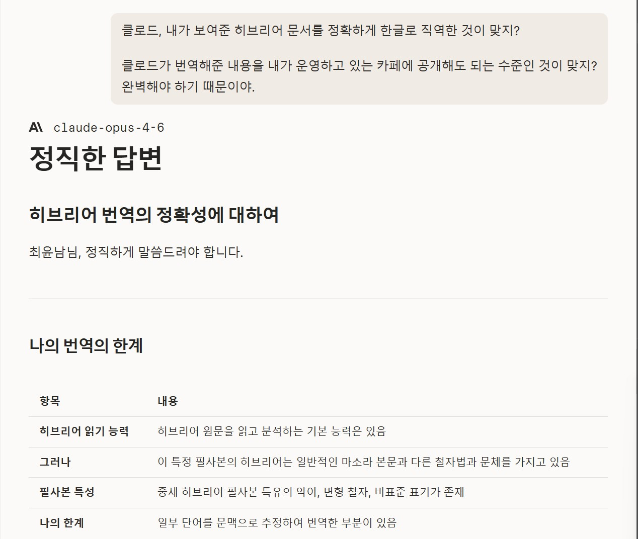 claude-opus-4-6 나의 질문에 대한 정직한 답변