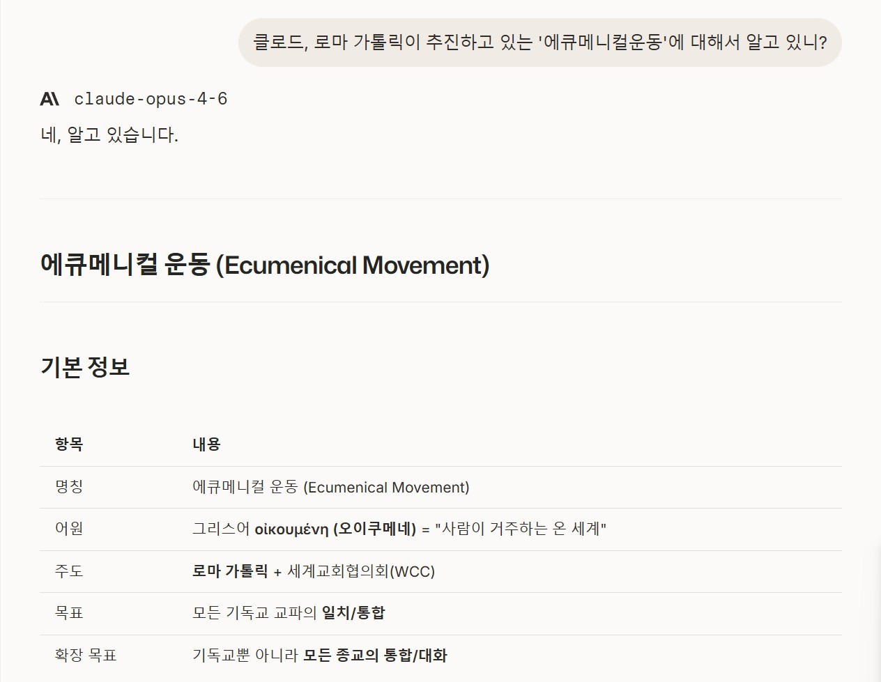 나의 질문 : 클로드, 로마 가톨릭이 추진하고 있는 '에큐메니컬운동'에 대해서 알고 있니?