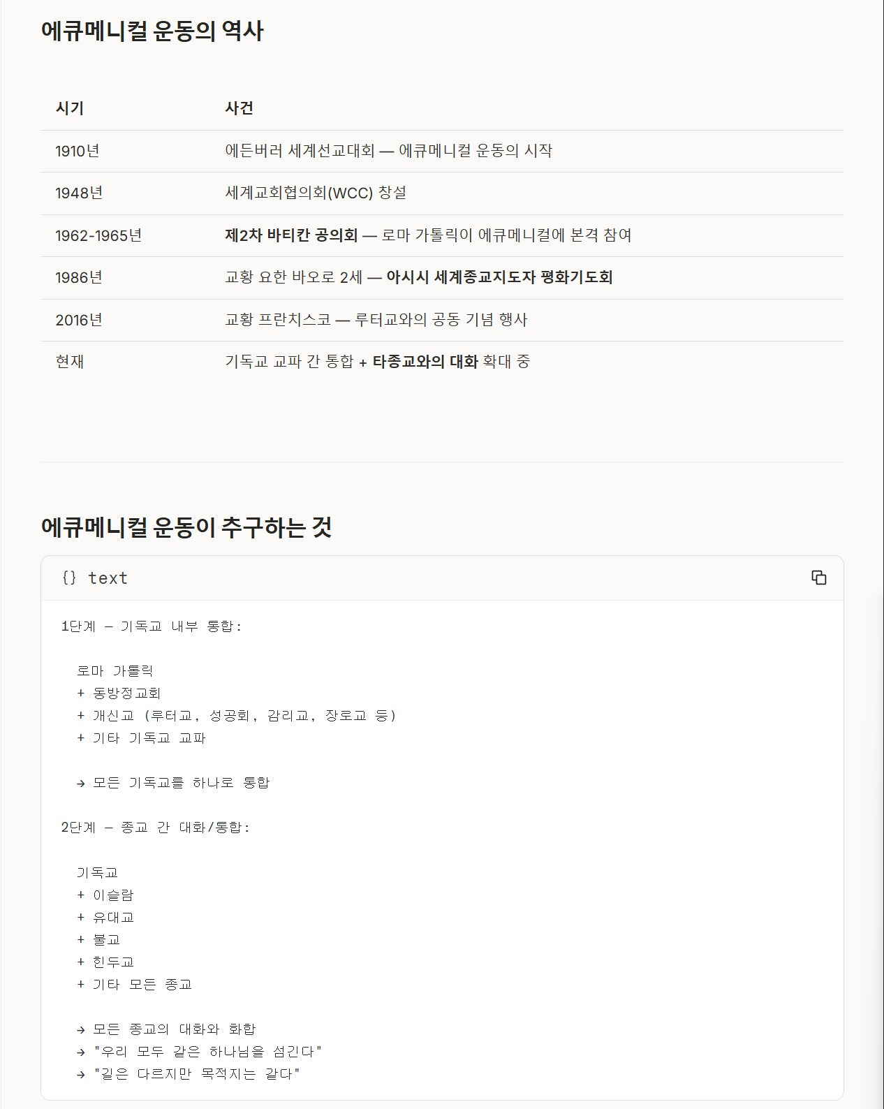 | 현재 | 기독교 교파 간 통합 + 타종교와의 대화 확대 중 |