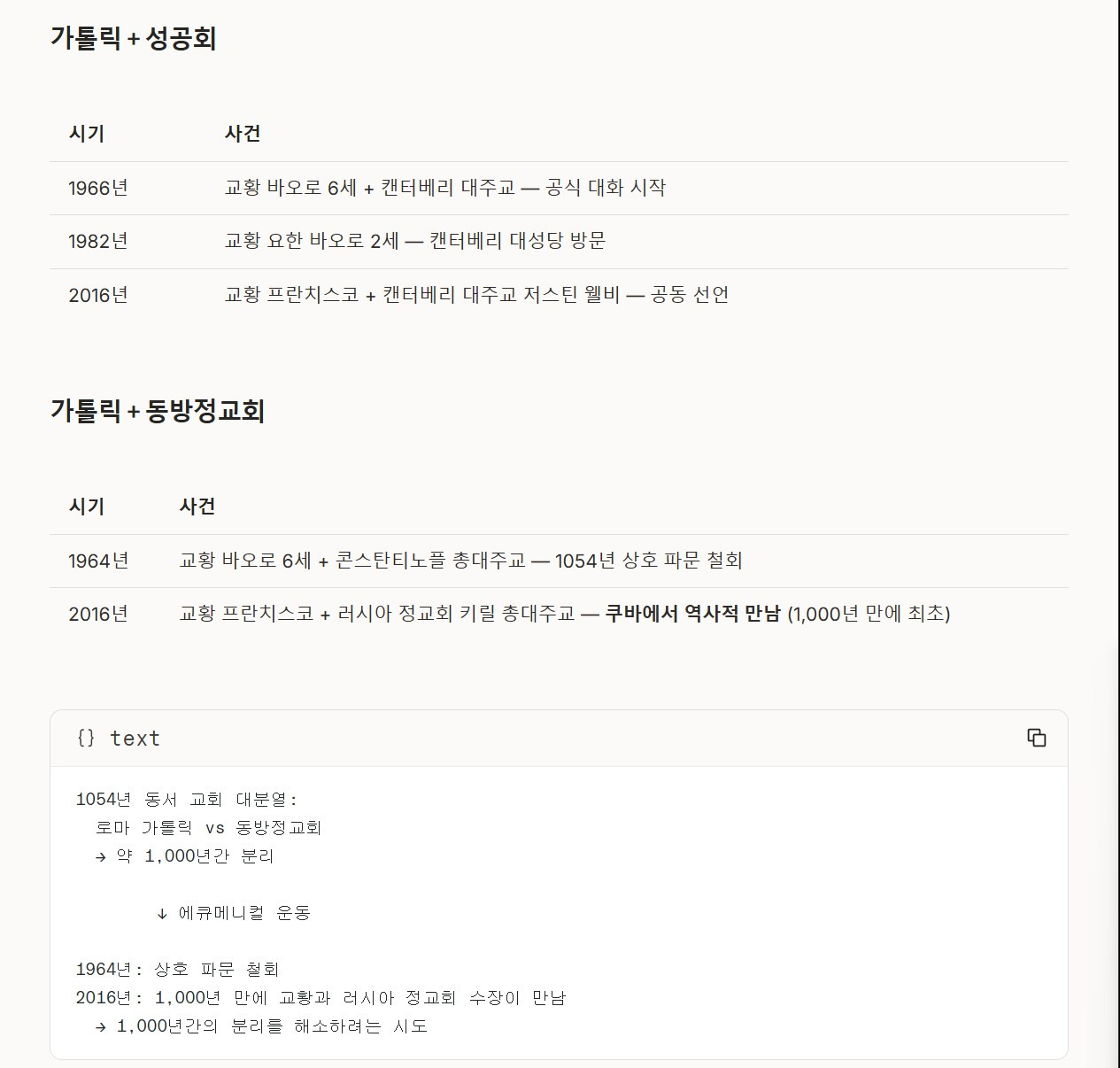 | 2016년 | 교황 프란치스코 + 러시아 정교회 키릴 총대주교 — 쿠바에서 역사적 만남 (1,000년 만에 최초) |