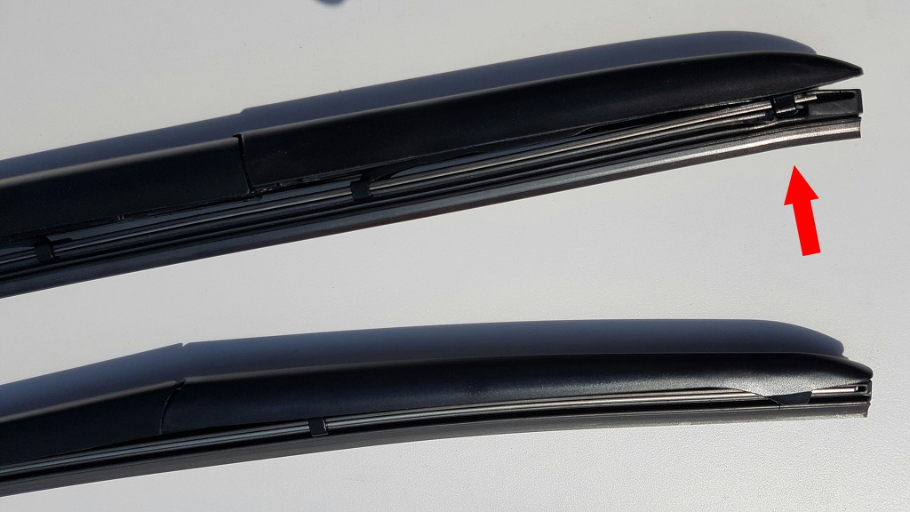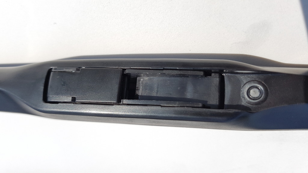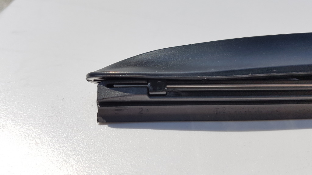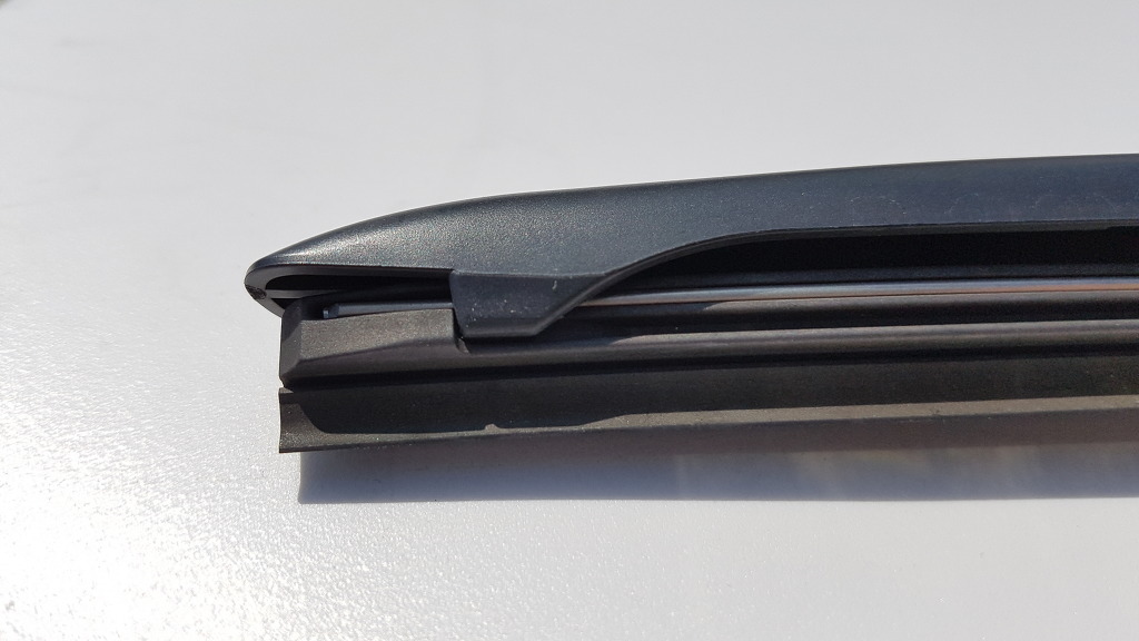 와이퍼 리필고무 고정부위가 저련형상을 하고 있습니다. (이 제품은 그냥 일반 와이퍼에 에어로케이스만 씌어놓은 모양의 와이퍼 입니다.)