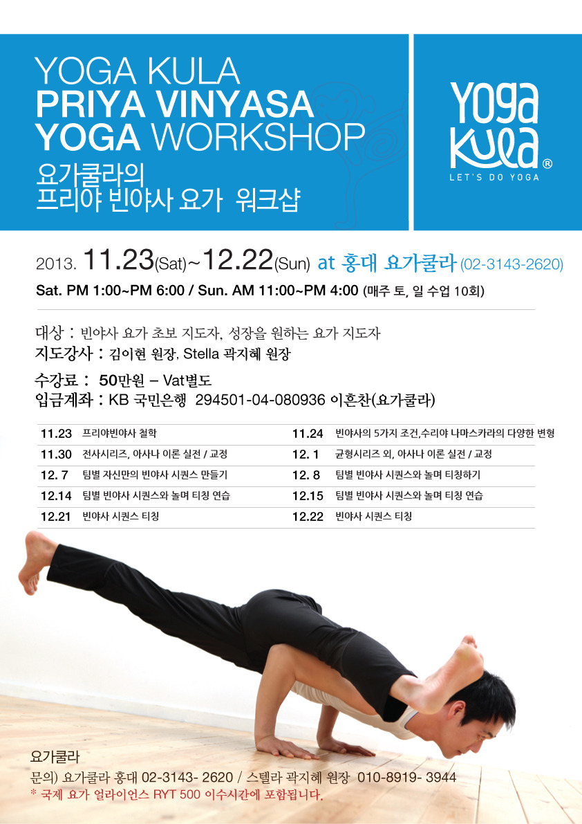 * 프리야빈야사 워크샵은 처음 빈야사 요가를 가르치시는 선생님들에게 빈야사 수업을 할 수 있게 도움을 줄 것이며 빈야사수련을 오래하신 분들에게도 많은 도움이 도리 것입니다 * 요가쿨라 국제 요가 자격증 요가 얼라이언스 RYT 200시간에서 50시간 이수 시간에 포함 할 수 있습니다 토 : 1시- 6시 / 일 : 11시-4시 총 50시간