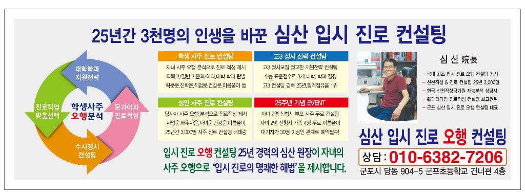 심산 원장 ○연세대학교 대학원 국어교육학과 전공 ○고려대학원 사회교육 최고경영자 과정 ○25년간 학생 3,000명 입시진로 컨설팅 ○25년간 성인 2,000명 사주진로 컨설팅 ○명문대 & 특목고 합격생 3,000명 배출 ○한국 선천적성평가원 재능분석 상담사 ○정법강의 5년간 6,000강 내공 멘토링 ○新패러다임 명리학 & 진로적성학 교수 ○대치동 & 군포 심산 국어 논술 학원장 ○군포 심산 입시 진로 오행 컨설팅 대표 新패러다임 명리학 & 진로적성학 강의 1.개강 안내 ※평일반/주말반 ※정규반(주1회) 속성반(주2회) 현재 예약 접수중! ○초급반(3개월/12주) ○중급반(3개월/12주) ○고급반(3개월/12주) ○전문반(3개월~6개월) 2.모집 대상 1.명리학 초보자나 동양철학과 심리상담학에 관심이 많은 분 2.타로카드 상담사로 명리학과 진로적성학을 배우고 싶은 분 3.전화운세 상담사로 명리학과 진로적성학을 배우고 싶은 분 4.사주카페,전통찻집,철학원,타로카페 오픈을 목표로 하는 분 5.철학관,심리상담소 운영자로 新패러다임을 융합하고 싶은 분 6.석사 박사 교수 출신으로 명리학과 진로적성학에 관심있는 분 3.강의 내용 ○명리학(음양오행,육친,격국,합형충파해,용신,新패러다임 실전통변) ○진로적성학(다중지능이론,강점지능,직업스타일,고입 대입 입시 전략) ○성명학(음양획수,원형이정격,발음,자원,용신작행,新패러다임 작명법)