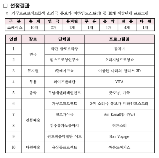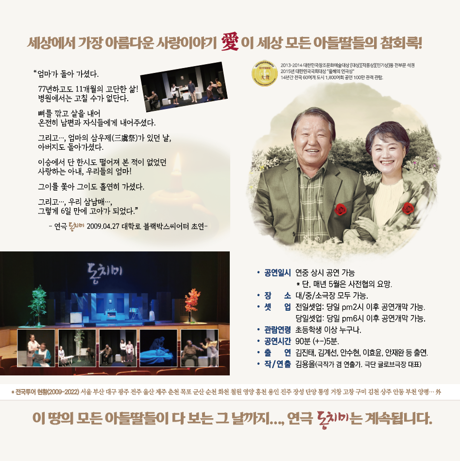 연극 "동치미" <2023년 문예회관과 함께하는 방방곡곡문화공감> 민간예술단체 우수공연프로그램 선정 작성자Globian66|작성시간22.10.11|조회수94 목록 댓글 0 글자크기 작게가 글자크기 크게가 다음검색 현재 게시글 추가 기능 열기 북마크 공유하기 신고 센터로 신고 댓글 댓글 0 댓글쓰기 답글쓰기 댓글 리스트