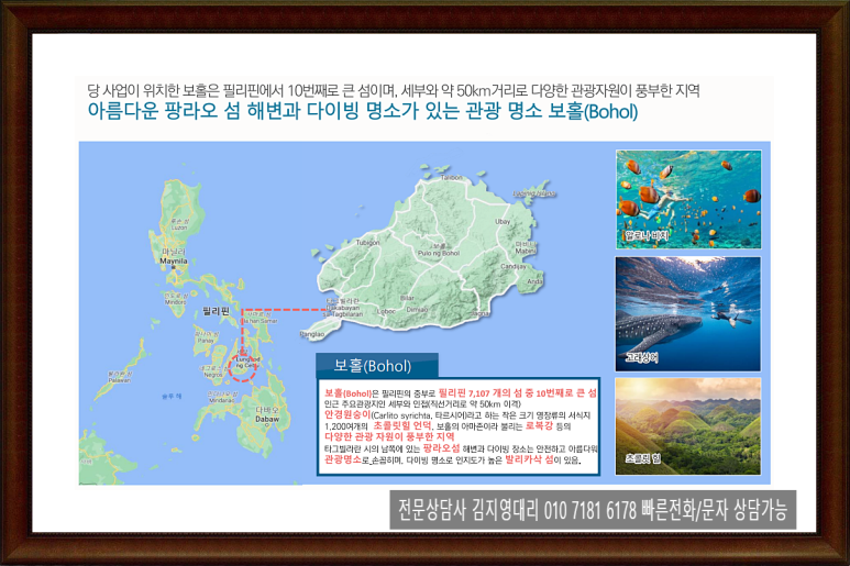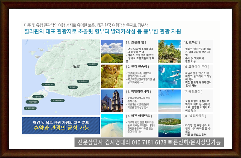 이지역은 필리핀 보홀에서 이미 유명한 관광지로 초콜릿힐, 안경원숭이,버진아일랜드, 고래상어투어,팡라오섬,발리카삭섬,로북강 등