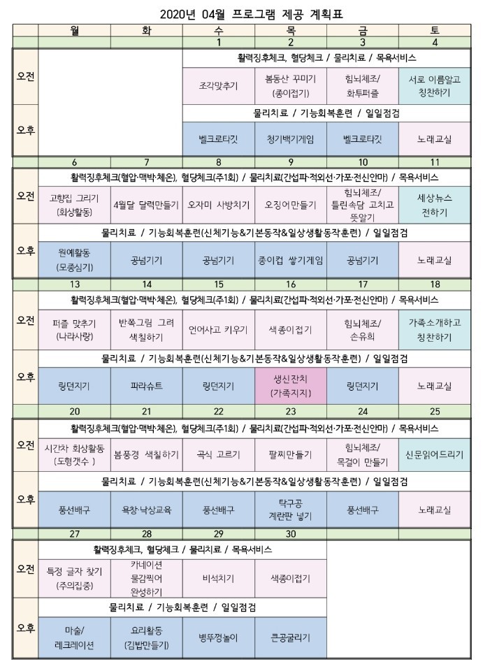 2020년 4월 프로그램 일정표 작성자양산재가노인복지센터|작성시간20.03.31|조회수12 목록 댓글 0 글자크기 작게가 글자크기 크게가 다음검색 현재 게시글 추가 기능 열기 북마크 공유하기 신고 센터로 신고 댓글 댓글 0 댓글쓰기 답글쓰기 댓글 리스트