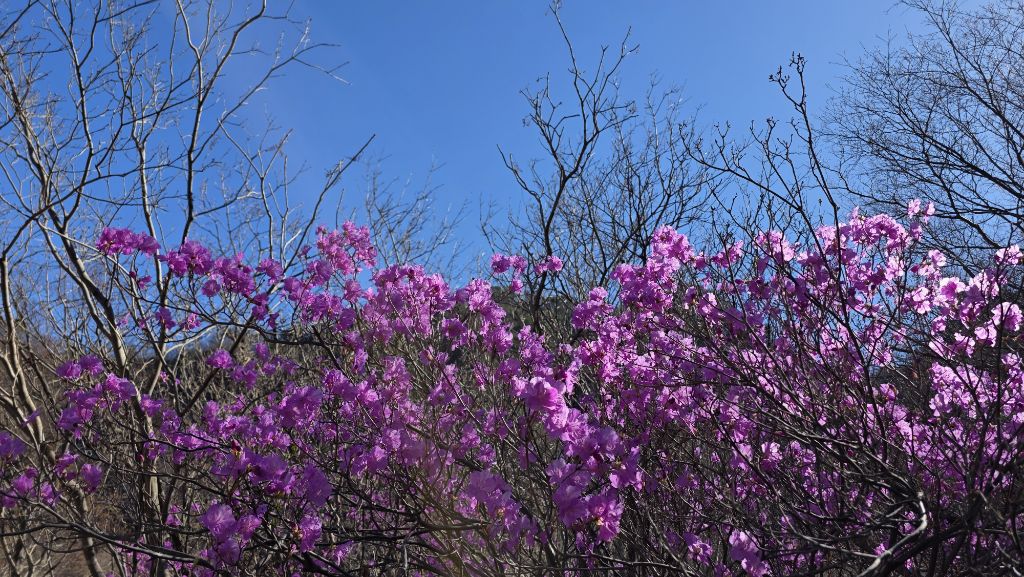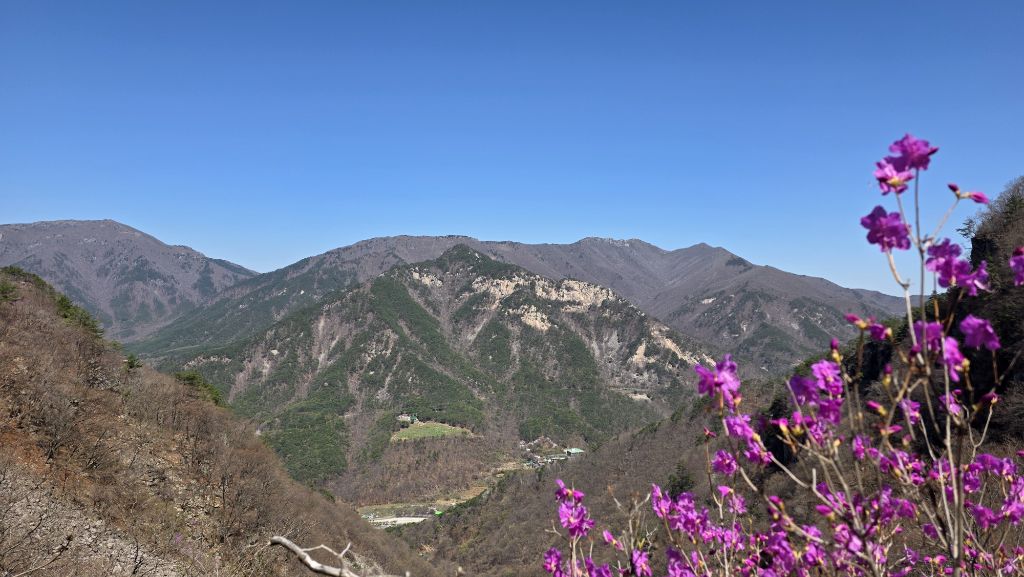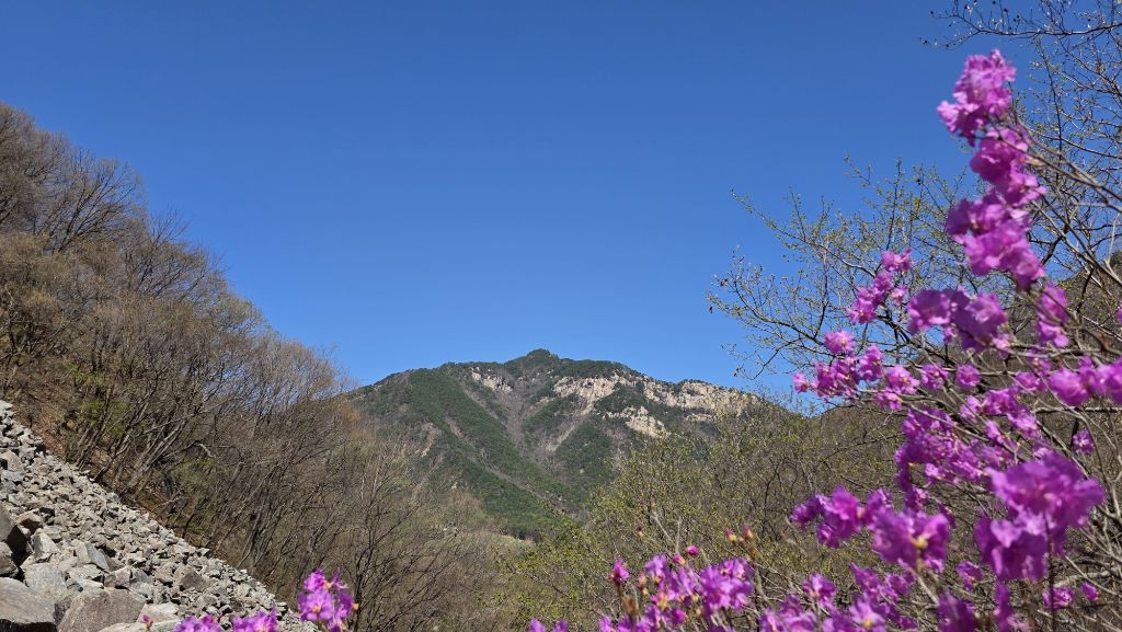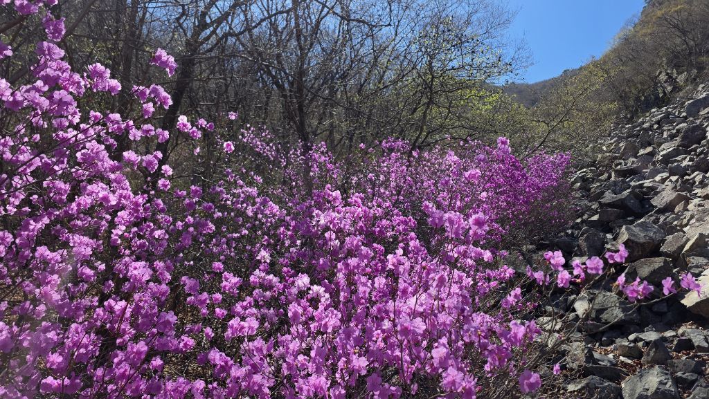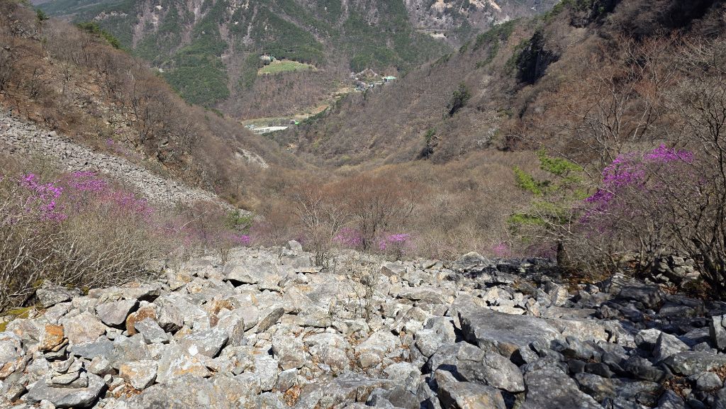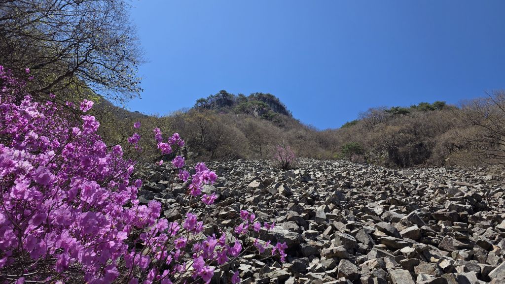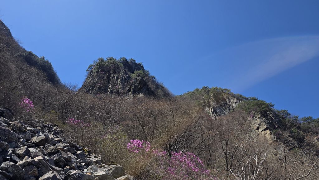 길도 험하고 아직 겨울도 남아 있지만 동의굴을 지나 얼음골 너덜겅에는 진달래가 봄을 맞이 하고 있다.