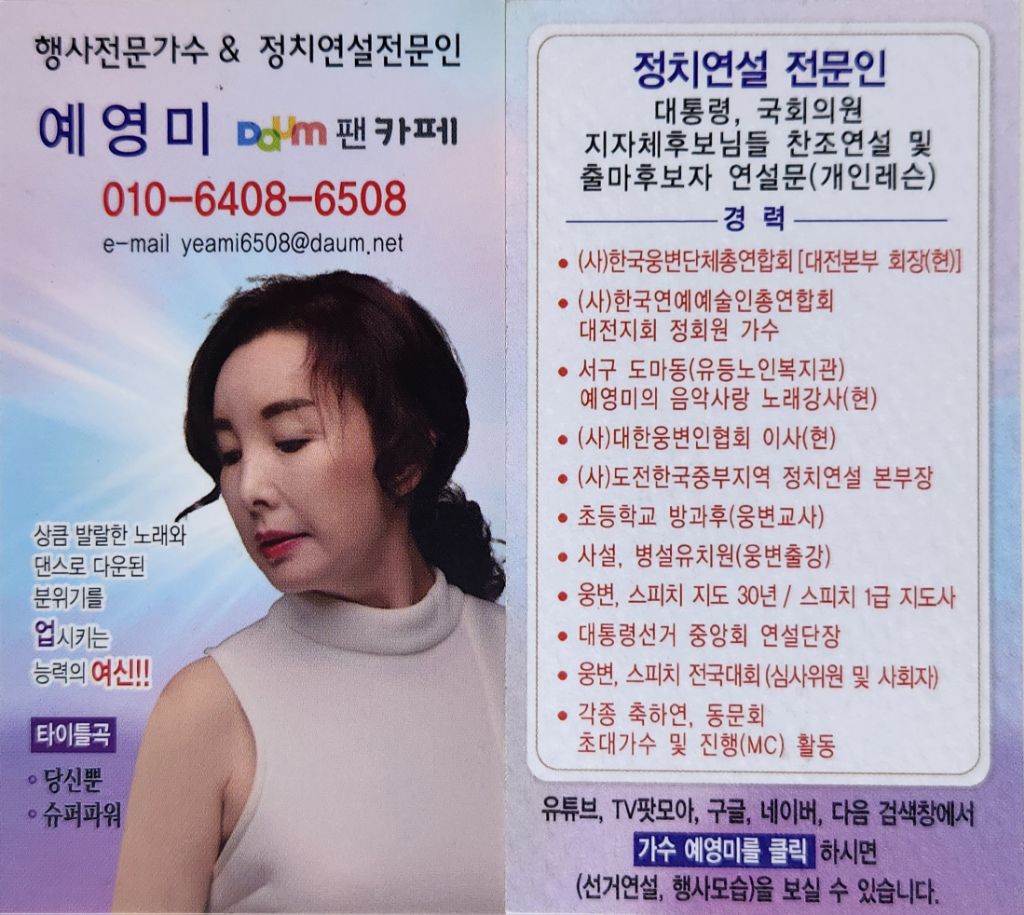 👉 ❤️ 예영미TV (행사전문가수 & 정치연설전문인) [유튜브 채널] 🩷🌸