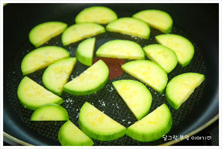 호박을 동글동글 썰어서 기름 조금 둘러 살짝 굽듯이 부쳐낸 다음,