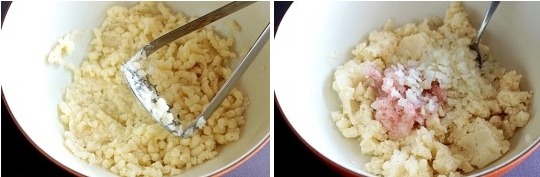 감자가 뜨거울 때 으깨는 조리도구나 포크로 곱게 으깨어 준 다음
