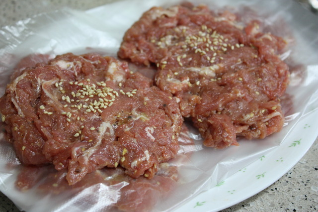 양념(간장5큰술, 다진마늘, 통깨, 후추, 스테이크소스1큰술,생강가루2꼬집)