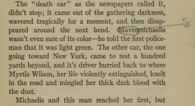 The “death car” as the newspapers called it, didn’t stop; it came out of the gathering darkness, wavered tragically for a moment and then disappeared around the next bend. Michaelis wasn’t even sure of its color– he told the first policeman that it was light green. The other car, the one going toward New York, came to rest a hundred yards beyond, and its driver hurried back to where Myrtle Wilson, her life violently extinguished, knelt in the road and mingled her thick, dark blood with the dust.