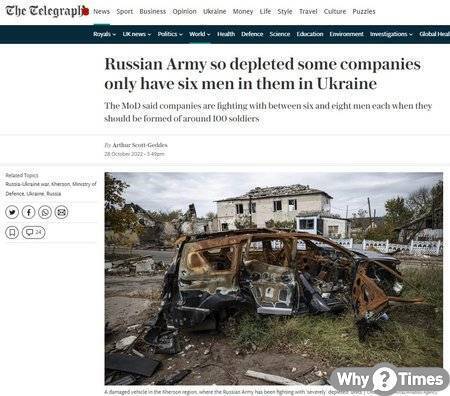 우크라이나전에 투입된 러시아군이 그야말로 껍데기만 남아 전의를 완전히 상실한 것으로 보인다. 영국의 텔레그래프는 10.28일(현지시간) 영국군 정보당국의 발표를 인용해 “100여명으로 구성되어야 할 러시아군 육군 중대가 대부분 6~8명 정도밖에 남지 않은 상태로 병력 고갈이 극심한 상황”이라면서 “러시아군이 헤르손 지역에서 방어전선을 펼치려 하고 있지만 병력과 물자의 부족으로 방어작전도 제대로 펼쳐나가기 힘든 상황”이라고 보도했다.