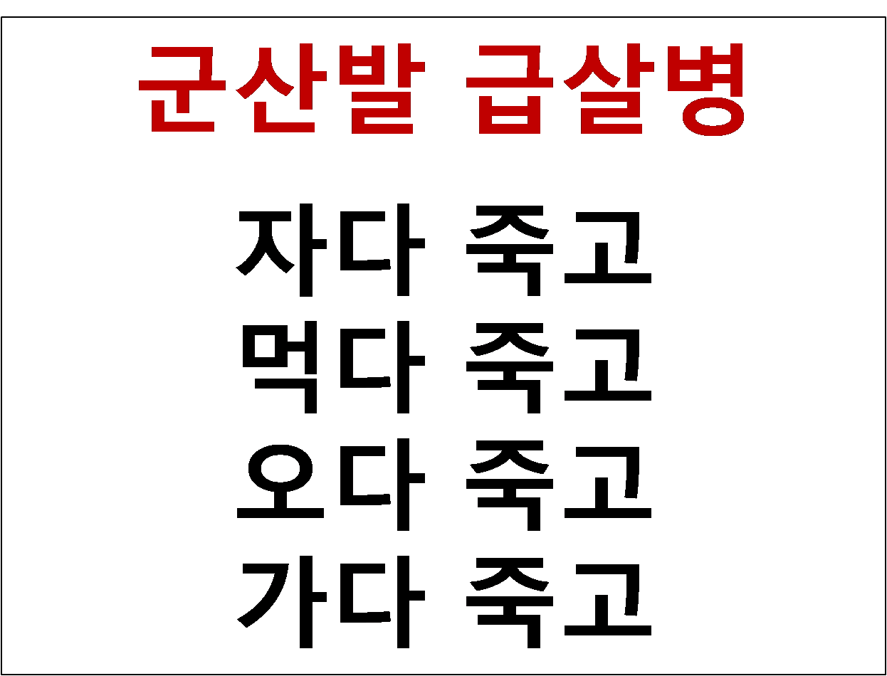한반도가 전무후무한 급변상황으로 질주하고 있습니다. 북사도 전란 남군산 병겁입니다. 2022년 우크라이나 전쟁이 평양발 전란으로 이어지고, 2019년 우한 코로나가 일본발 천연두로 발전하면, 군산발 급살병이 터집니다. 자다 죽도 먹다 죽고 왕래하다 죽는 초급성 괴질입니다. 신명계와 인간계가 총체적인 대변혁을 맞이하는 후천개벽기에, 급살병으로 독기와 살기의 상극인간을 대청소하여 영혼을 영원히 흩어버립니다. 군산에서 급살병이 시작되면 병원과 약국은 무용지물이 됩니다. 군산발 급살병을 앞두고 의료대란이 벌어지고 있습니다. 의사는 파업하고 병원은 휴업하고 의대생은 휴학하여, 환자가 치료할 곳을 찾지 못하고 있습니다. 급살병에 속수무책일 징조입니다.