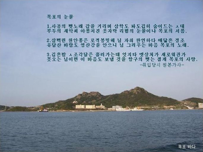 유달산 잔디 위에 놀던 옛날도/ 동백꽃 쓸어안고 울던 옛날도/ 그리운 내 고향 목포는 항구다 목포는 항구다