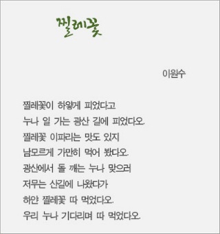 동시 <찔레꽃>은 <고향의 봄>을 쓴 이원수가 1930년에 잡지 <신소년>에 발표한 노래다. 찔레꽃은 ‘누나가 일가는 광산 길’에 하얗게 핀 꽃이다. 소년은 누나를 맞으러 ‘저무는 산길에 나왔다가’ 하얀 찔레꽃을 따먹는다. 글쎄, 찔레 순은 몰라도 찔레꽃을 따먹는 건 낯설다.