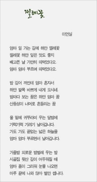 그러고 보면 찔레꽃은 서민들의 고단한 삶과 가난을 증언하는 꽃이다. 찔레꽃은 보릿고개를 힘겹게 넘던 시절의 어린이들 곁을 지켰던 꽃인 것이다. 아이들의 허기와 무료를 달랬던 찔레 순과 그 하얀 꽃은 절대빈곤의 시대에 대한 원초적 기억이다.