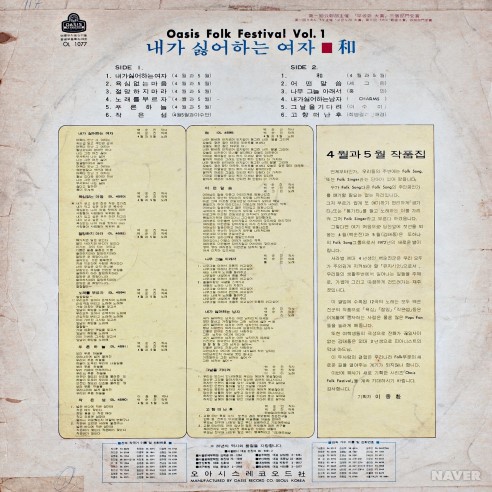 1972년 오아시스레코드는 백순진과 이수만이 결성한 인기 남성 듀오 4월과5월의 데뷔 앨범을 발매했다. 타이틀곡 <내가 싫어하는 여자>, <화> 등 4월과5월의 노래는 정식 스튜디오에서 녹음한 게 아니라 방송용으로 녹음한 음원이라 음질이 열악한 편이었다. 사람들이 꺼리는 숫자 ‘4’를 팀 이름에 넣었듯, 이들은 음반도 4월 4일에 발매했다. 이 앨범은 1960~1970년대의 인기 DJ 이종환이 기획한 ‘오아시스 포크 페스티발’ 시리즈 음반의 첫 음반이다. 앨범 커버는 4월과5월이 장식했지만 실제로는 쉐그린, 홍민, 챰스, 이수미, 최병결과 안혜경 등이 부른 12곡을 수록된 컴필레이션 음반이었다.